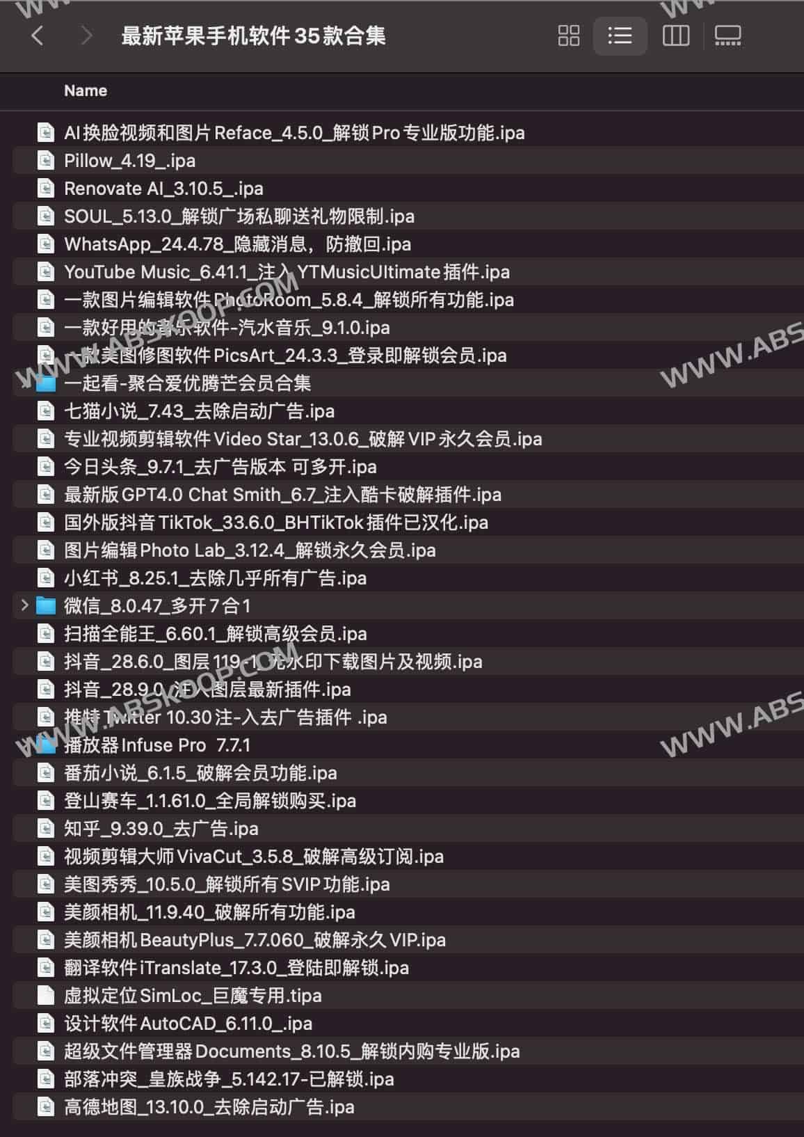 最新苹果手机软件35款合集,解锁版ipa软件资源,解锁各种功能限制,需要配合巨魔等等软件进行安装,包括iOS微信分身、虚拟定位、国际版抖音TikTok解锁版、AI换脸视频和图片Reface专业版等等,夸克网盘资源下载。