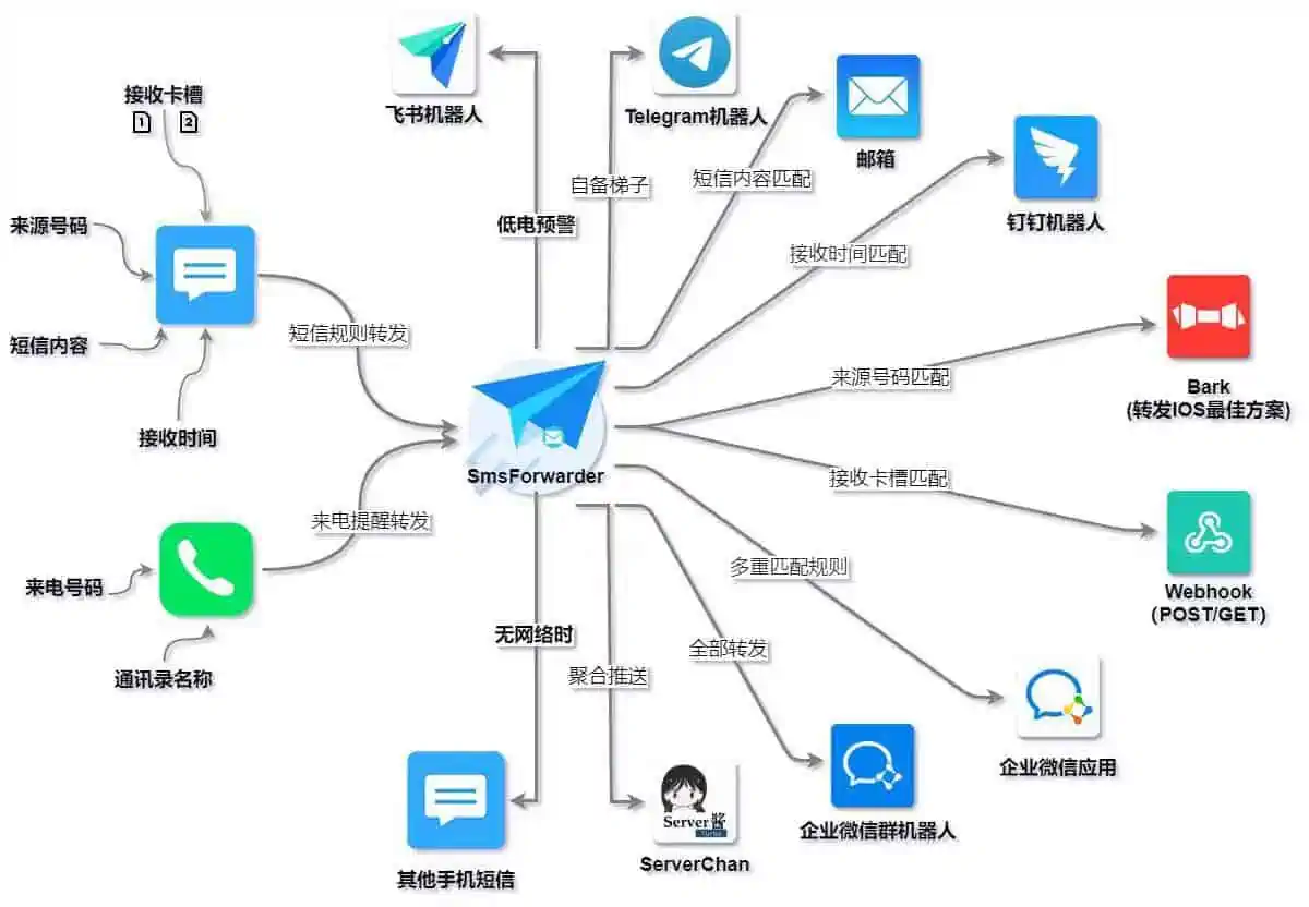 监控Android手机短信并根据指定规则转发到其他手机:钉钉机器人、企业微信群机器人、飞书机器人、企业微信应用消息、邮箱、bark、webhook、Telegram机器人、Server酱、手机短信等。