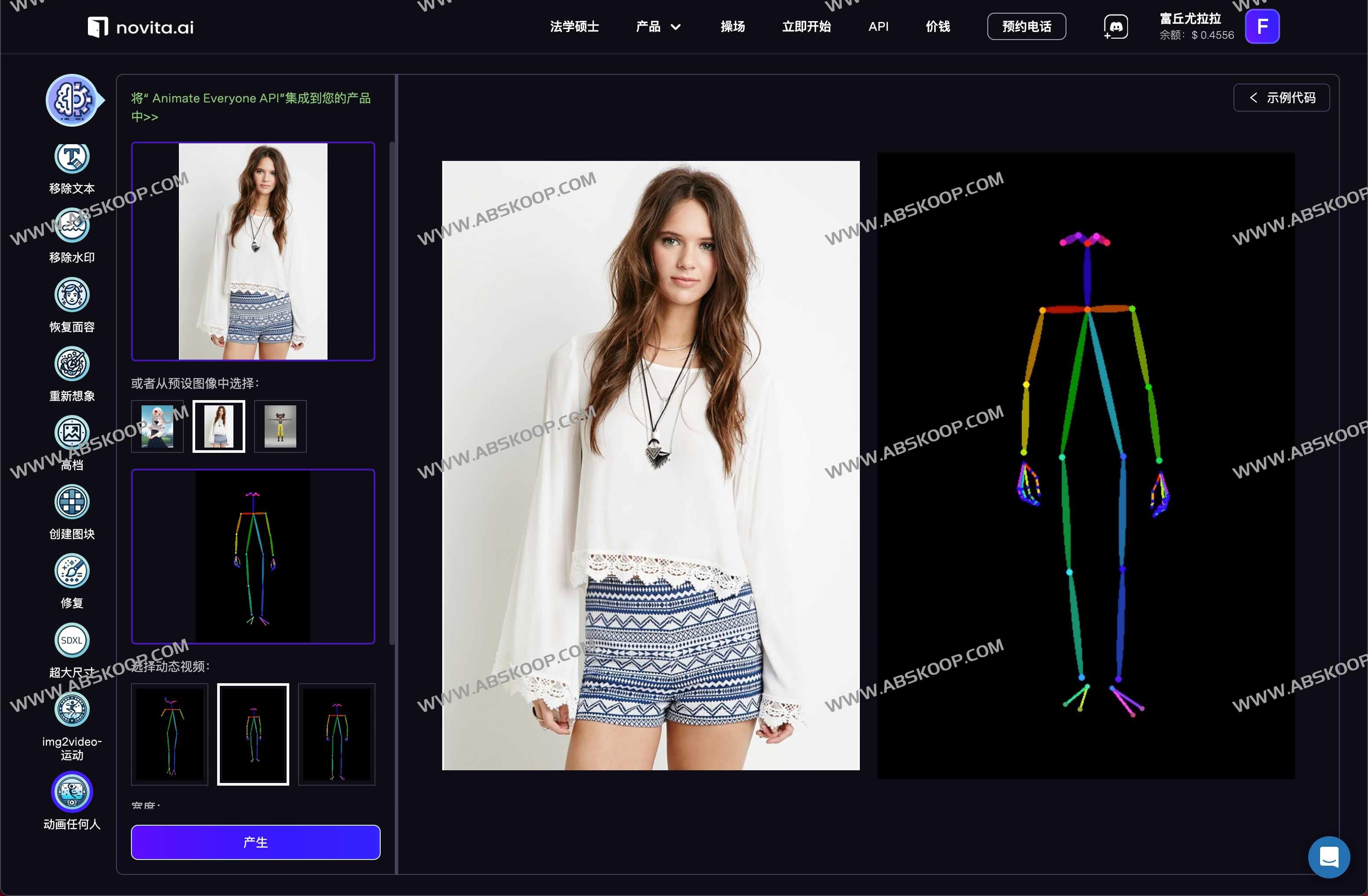 AnimateAnyone-静态图片到视频生成器,让任何人都动起来,是一个Novita AI 对 Animate Everyone 的非官方实现项目,此存储库目前提供Animate Everyone的非官方预训练权重和推理代码,目前可以实现文字转图片、文字转视频、图片转视频、换背景、替换对象、移除水印等等操作。