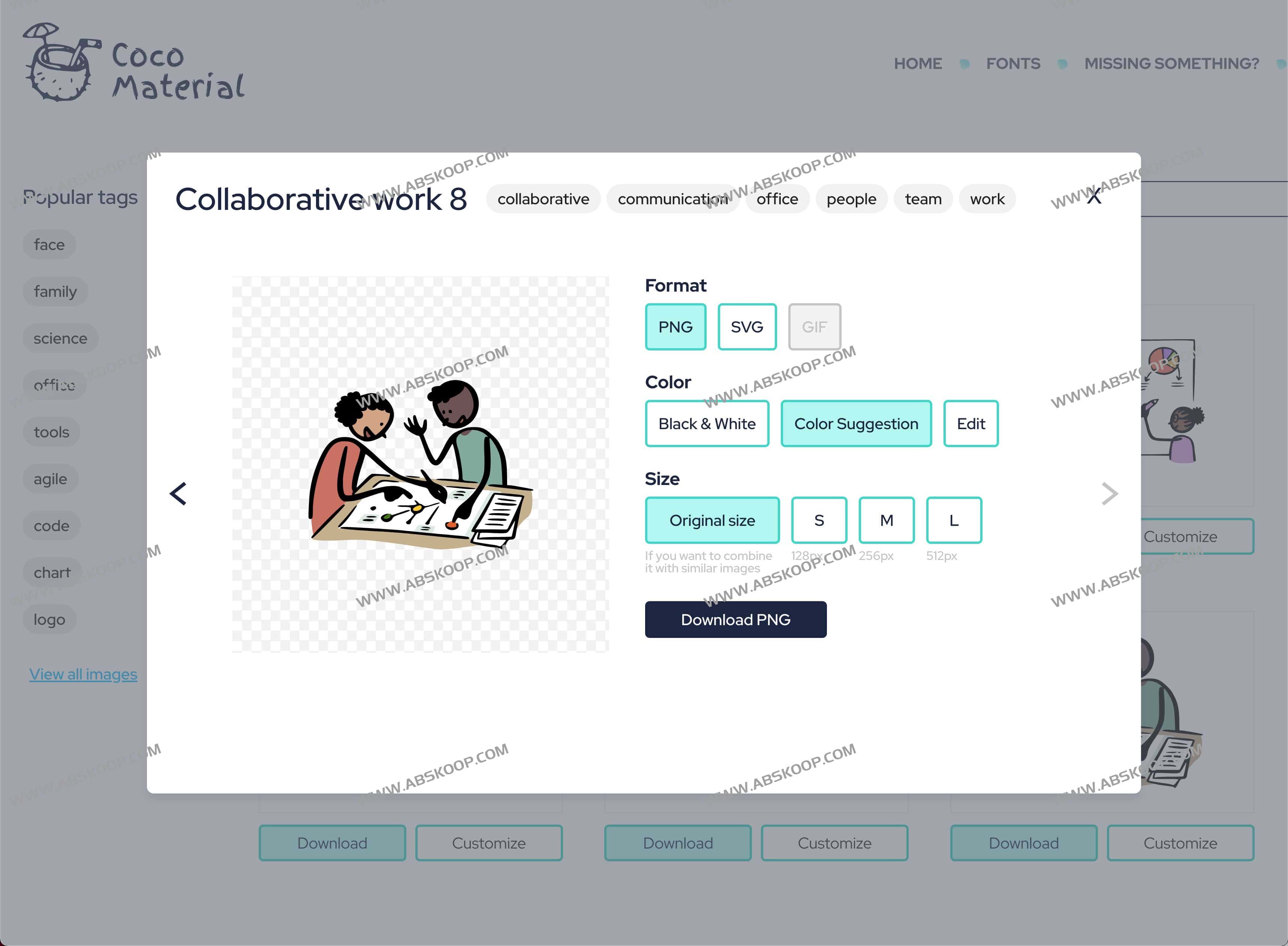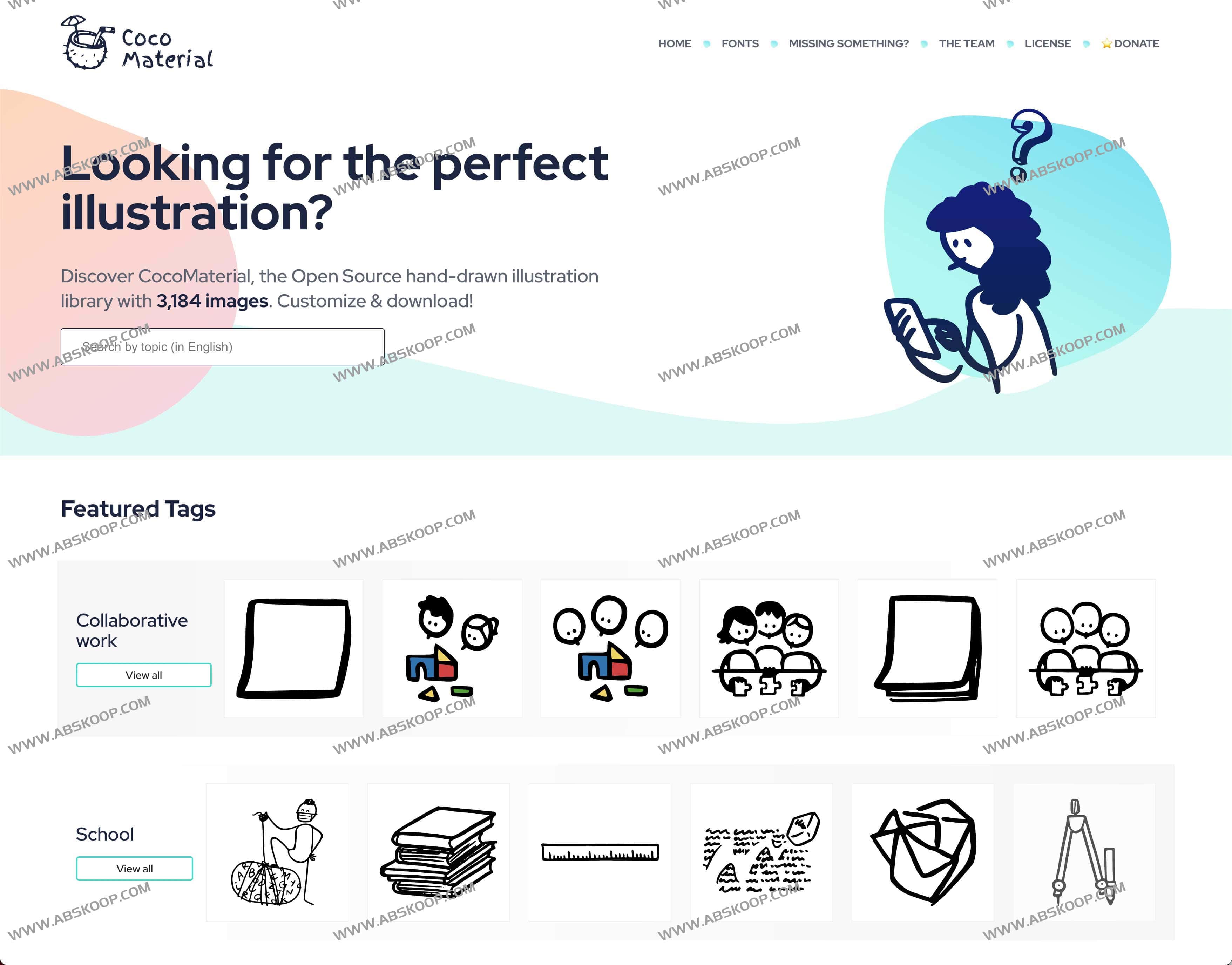 CocoMaterial是一个在线高质量开源手绘插图库,目前拥有3184 张图片的开源手绘插图库,提供工作、学校、植物、动物、音乐、技术、烹饪等等各种类型的手绘插图,可以自定义并下载,支持PNG、SVG、GIF格式下载,可定制插图大小和颜色等等,免注册使用。