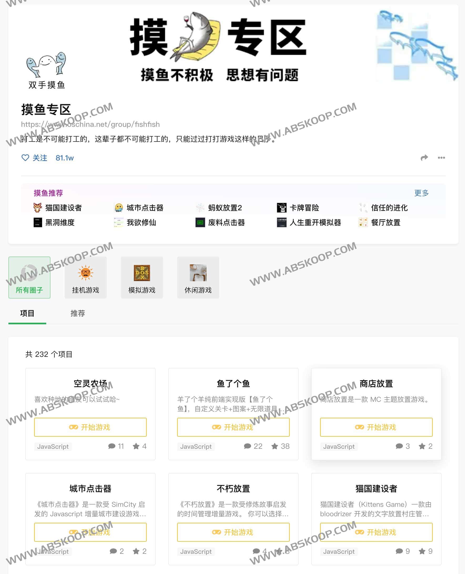 摸鱼专区 OSChina是OSChina一个群组社区:摸鱼专区,专门收集一些适合摸鱼的小游戏,包括模拟游戏、挂机游戏、休闲游戏等等,例如猫国建设者、城市点击器、蚂蚁放置、人生重开模拟器、黑洞维度等等,都是一些热门的游戏,打工是不可能打工的,这辈子都不可能打工的,只能过过打打游戏这样的日子。