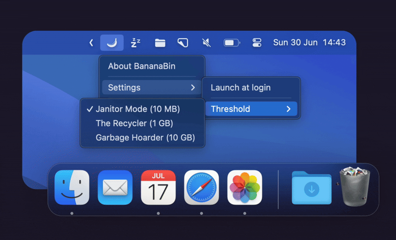 BananaBin-废纸篓上生苍蝇,是一款macOS上面的有趣实用工具软件,使用苍蝇动画有趣得提醒你清理Mac垃圾桶了(回收站),当你的垃圾箱占用了大量的磁盘空间时,BananaBin 会通过向你的垃圾箱添加交互式苍蝇来使这一情况可见,提醒你垃圾桶的状态,而且使用也非常简单,通过单击小香蕉来配置应用程序中的磁盘空间阈值,当触发阈值时,苍蝇开始嗡嗡作响,每小时都会增加更多的苍蝇。清空垃圾箱,或将其悬停在垃圾箱上方以吓跑苍蝇,目前测试阶段免费使用。