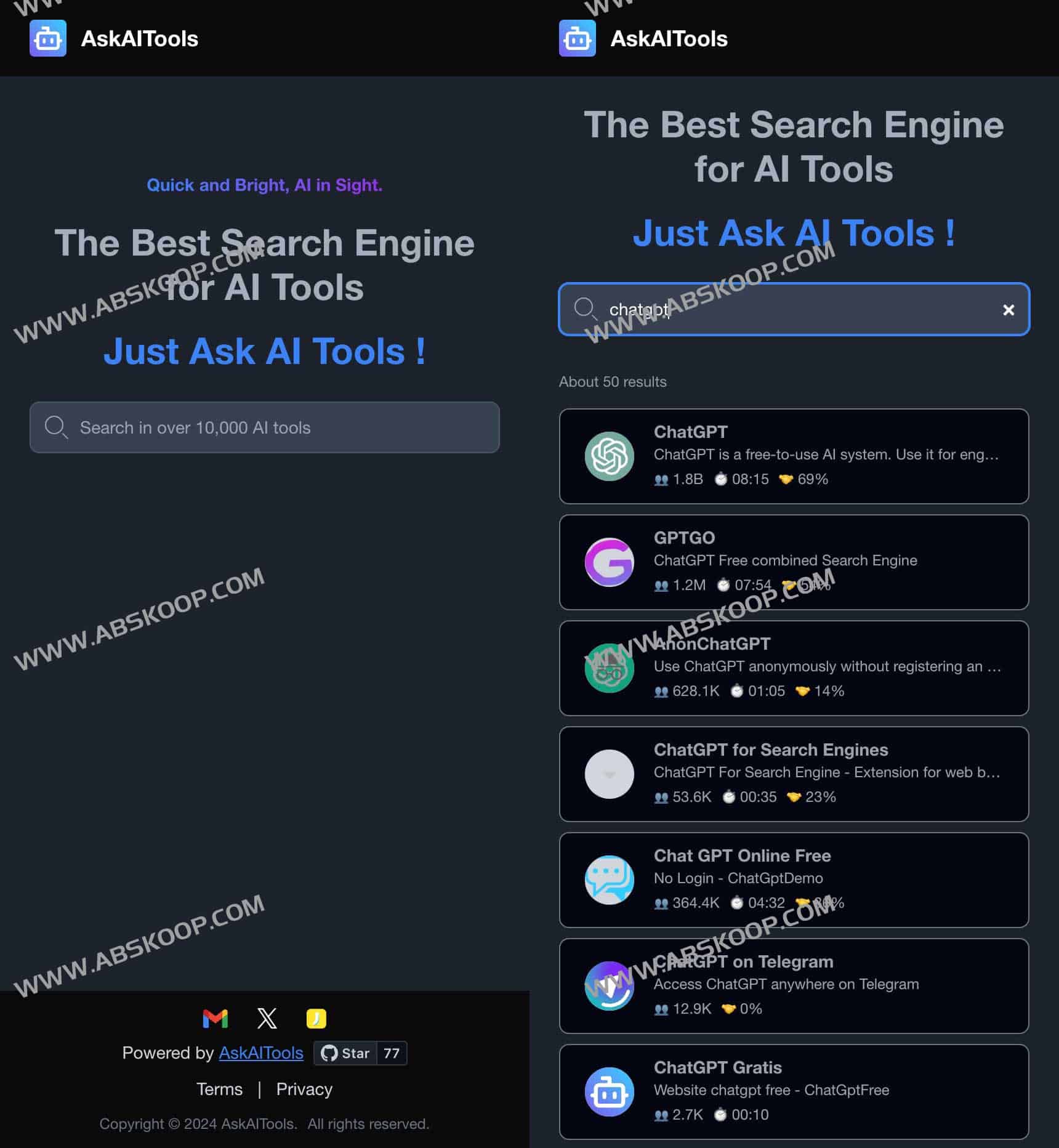 AskAITools 是一款最佳的人工智能工具搜索引擎,专为AI产品量身定制的前沿搜索引擎项目,提供最准确、最全面、最快速和最智能的搜索体验,帮助用户找到合适的AI产品。项目采用开源代码,前端使用 Next.js,并部署在 Vercel 上,数据库为 Supabase。作为一个垂直领域的关键词和语义混合搜索引擎,它是作者在体验了 200 款 AI 导航站后,为了改善用户体验而创建的。AskAITools 收录了超过 1 万款应用,远超市面上 95% 的 AI 导航站。它结合了关键词和语义搜索,比传统搜索方式更全面。每个搜索结果都会展示月访问量、停留时长、互动率等指标,帮助用户决策。排序时考虑了相关性和月访问量数据,确保结果既相关又高质量。作为 MVP,这款工具只有搜索功能,页面简洁无广告。