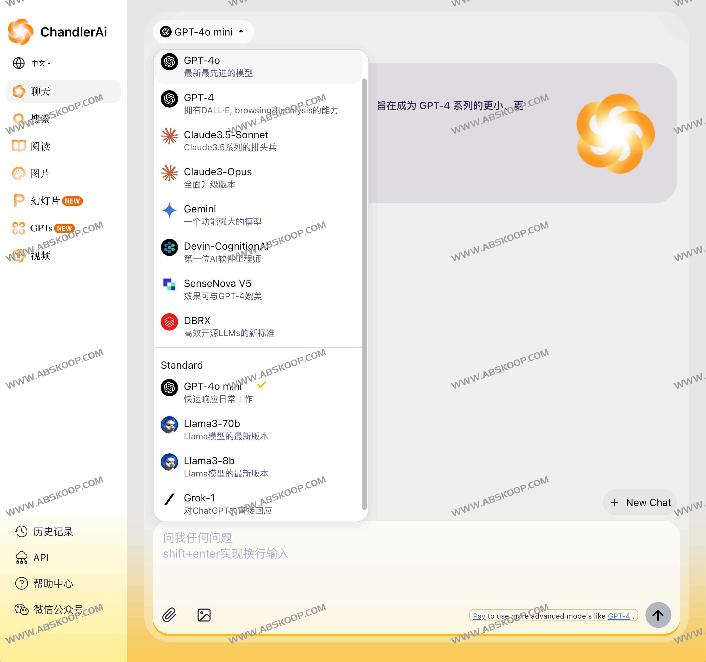 ChandlerAi是一款跨平台聚合多功能实用AI助手,拥有GPT-4、AI图像生成、AI视频生成、PDF阅读、AI搜索、PPT创建等功能。全球数百万用户使用ChandlerAi,可以与包括GPT-4、Claude3 Opus、Gemini、Llama3、GPT-3.5在内的先进AI模型聊天,学习新语言并进行语法纠正。每个注册用户可享受10次高级模型查询(如GPT-4o、GPT-4、Claude3.5 Sonnet、Claude3 Opus),并可无限次使用基础模型(如GPT-3.5、Llama3 70B)。支持网页端、MacOS、Windows和Chrome网上应用店。