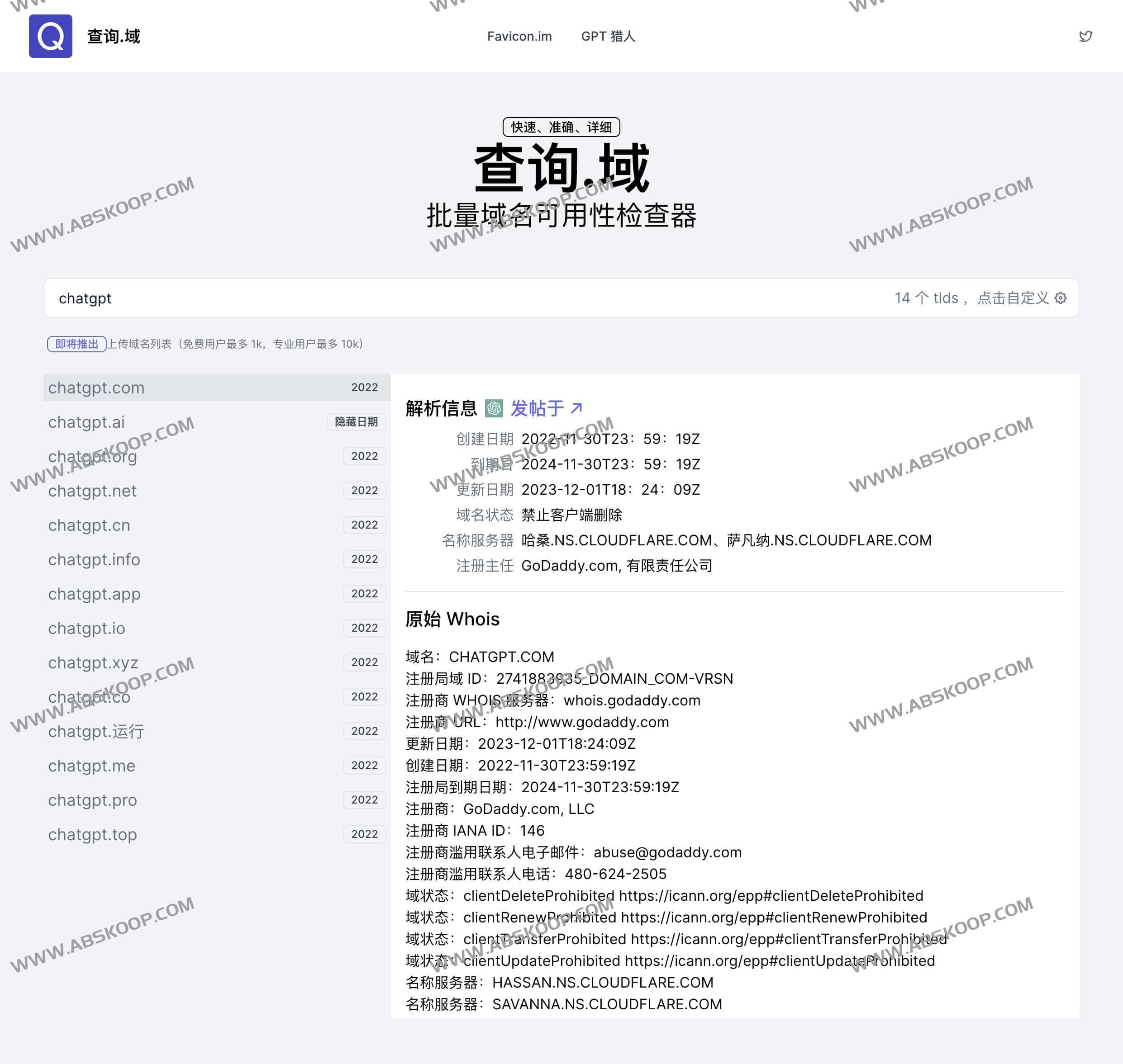 Query.Domains是一款在线免费批量域名可用性检查和 WHOIS 查询工具,工具可以批量 WHOIS 检查工具,可根据 WHOIS 查询检查域名可用性等等。工具可为你的域名查询和批量 WHOIS 检查提供快速、准确且详细的结果,还提供提供批量 WHOIS 检查和域名可用性查询 API。