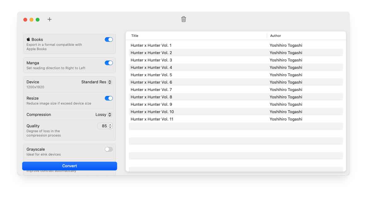 Comic2Books是一款 macOS 应用程序,用于将漫画转换为 EPUB 格式,适用于 Apple Books 和其他电子阅读器设备,支持ZIP、CBZ、RAR、CBR和PDF文件的输入,支持自定义输出图像质量、智能裁剪(支持删除偶数页码)、自动或手动增强对比度、自动分割双页(方便纵向阅读)等等。
