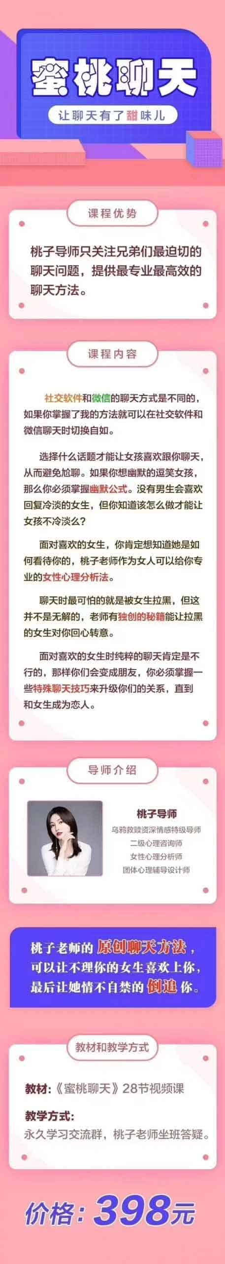 面对喜欢的女生时纯粹的聊天肯定是不行的,那样你们会变成朋友,你必须掌握一些特殊聊天技巧来升级你们的关系,直到成为恋人。社交软件和微信的聊天方式是不同的,如果你掌握了本教程的方法就可以在社交软件和微信聊天时切换自如。桃子老师的原创聊天方法,可以让不理你的女生喜欢上你,最后让她情不自禁的倒進你。