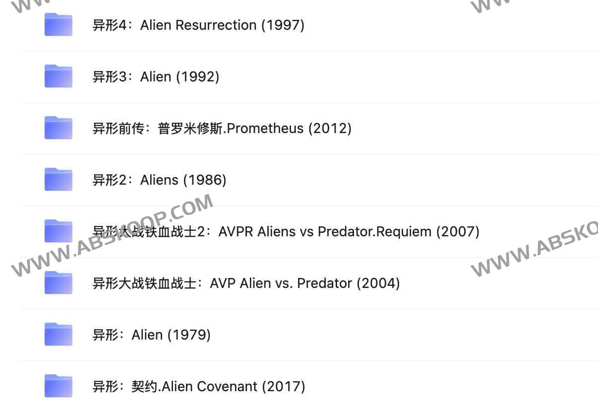 异形 系列电影合集,包活异形4:Alien Resurrection (1997)、异形3:Alien (1992)、异形前传:普罗米修斯.Prometheus (2012)、异形2:Aliens (1986)、异形大战铁血战士2:AVPR Aliens vs Predator.Requiem (2007)、异形大战铁血战士:AVP Alien vs. Predator (2004)、异形:Alien (1979)、异形:契约.Alien Covenant (2017),夸克网盘和阿里云盘资源下载。