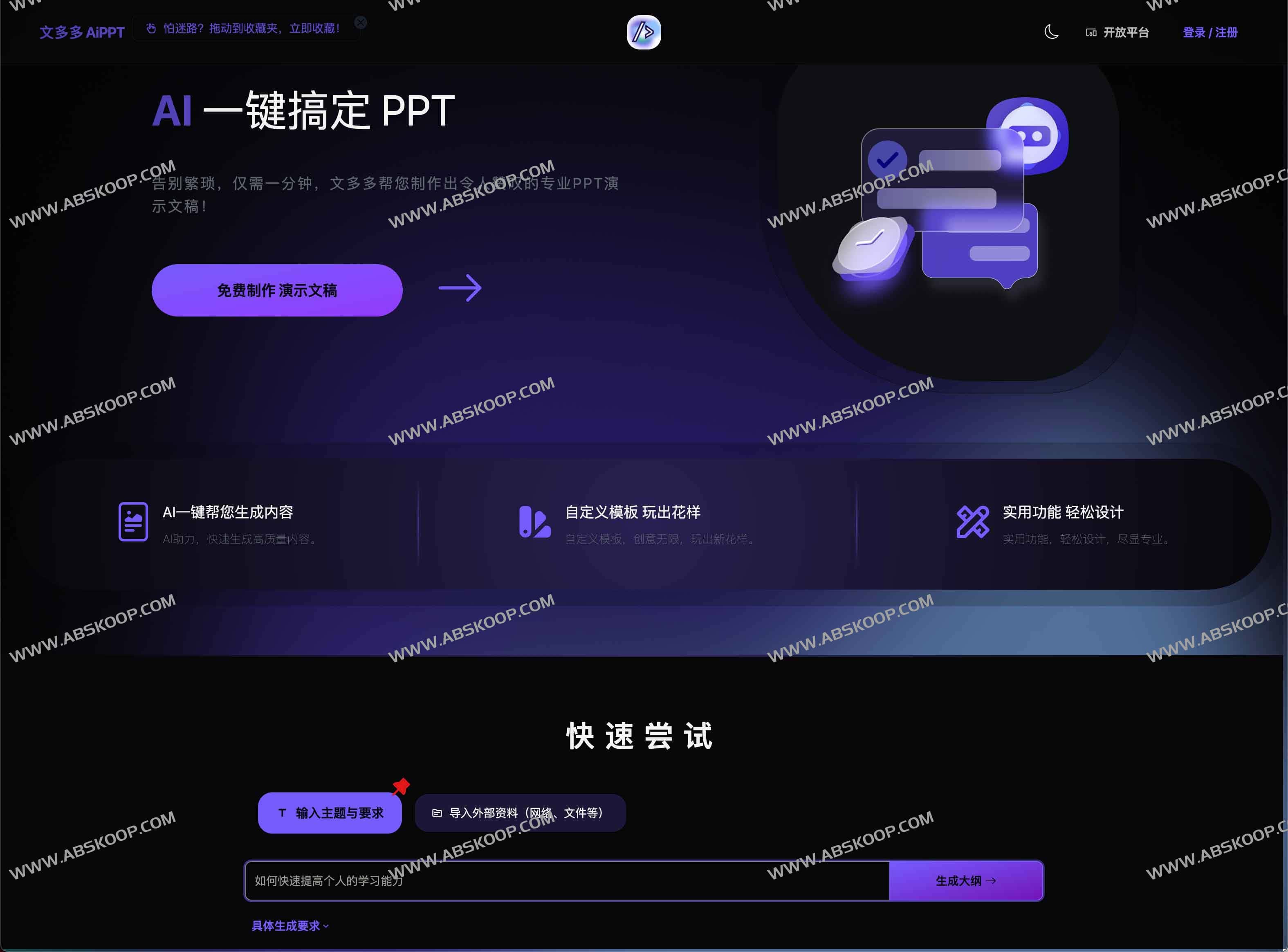 文多多 AiPPT是一款在线AI智能生成PPT演示文稿工具,一键搞定PPT,告别繁琐,仅需一分钟,文多多帮你制作出令人赞叹的专业PPT演示文稿。AI根据主题、文档、网址智能生成PPT文档,同时支持在线编辑、美化、排版、导出、一键动效、自动生成演讲稿等功能,告别工作烦恼,目前文多多 AiPPT支持AI 智能生成 PPT,PPT 解析为 JSON,JSON 反渲染为 PPT,商用级 AiPPT 项目等等,支持定制化行业解决方案,支持原生图表、动画等复杂PPT解析和渲染,支持用户自定义模板,可在线体验。