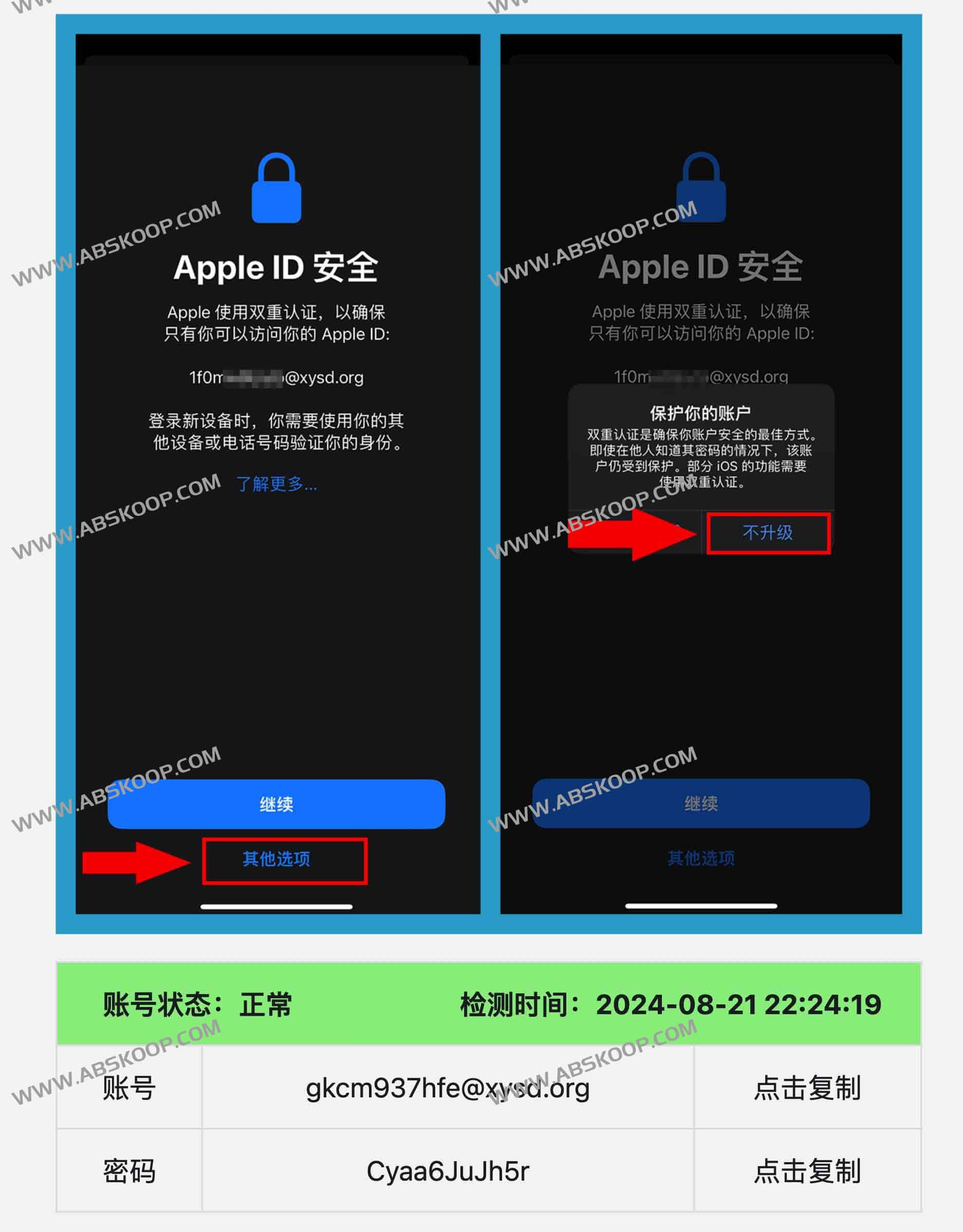 2. 选用下面账号登录 App Store。在弹出 Apple ID 安全画面中点击「其他选项 -> 不升级」,切勿开启双重认证!