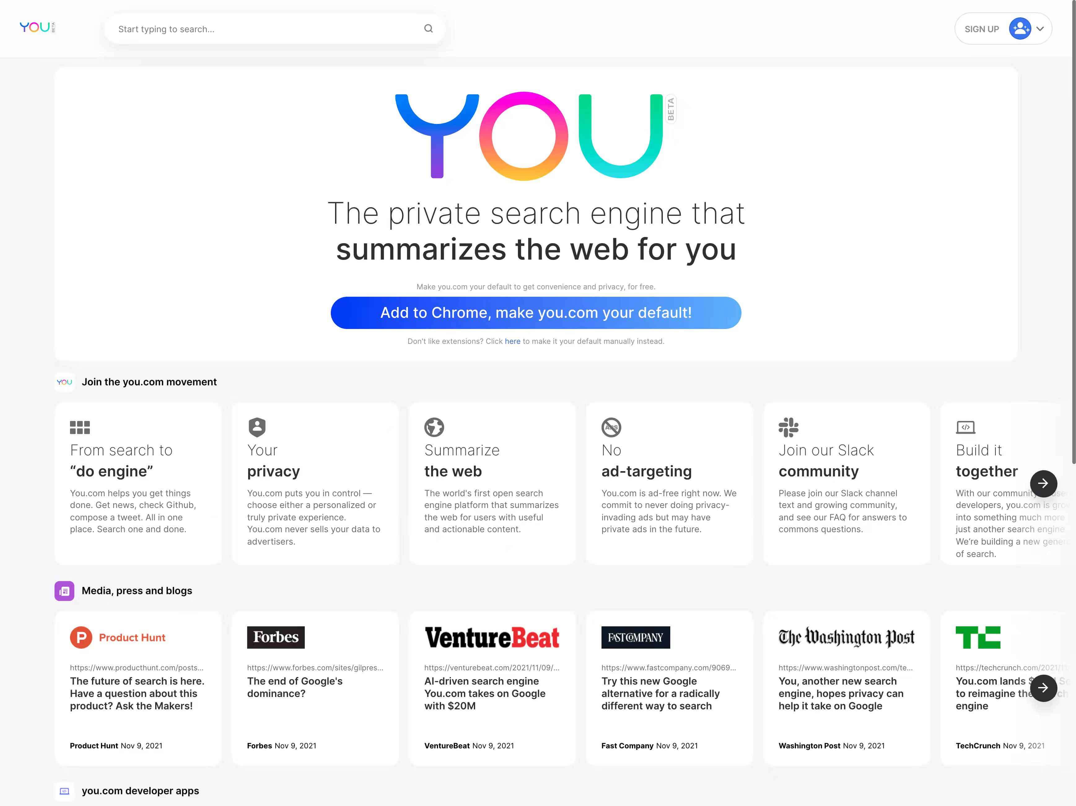 You.com自称是世界上第一个开放的搜索引擎,在You.com上,像Reddit、Quora、Stack Overflow和Medium这样的资源可以通过一个查询来搜索。例如,程序员可以搜索代码片段,并获得You.com的人工智能生成的摘要。You.com 提高了隐私标准,提供了”零痕迹”隐身模式的选择。