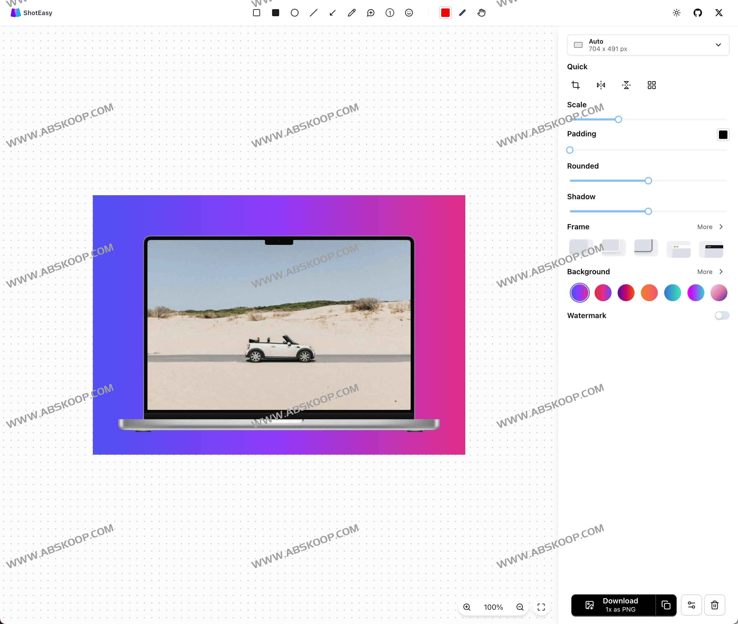 ShotEasy是一款在线截图美化工具,在线屏幕截图美化器工具可帮助你美化屏幕截图,目前支持添加批注,裁剪,局部放大等,并预设各社媒尺寸和导出高清图,并且支持设备套壳(macbook/iphone等)截图美化/套壳截图。