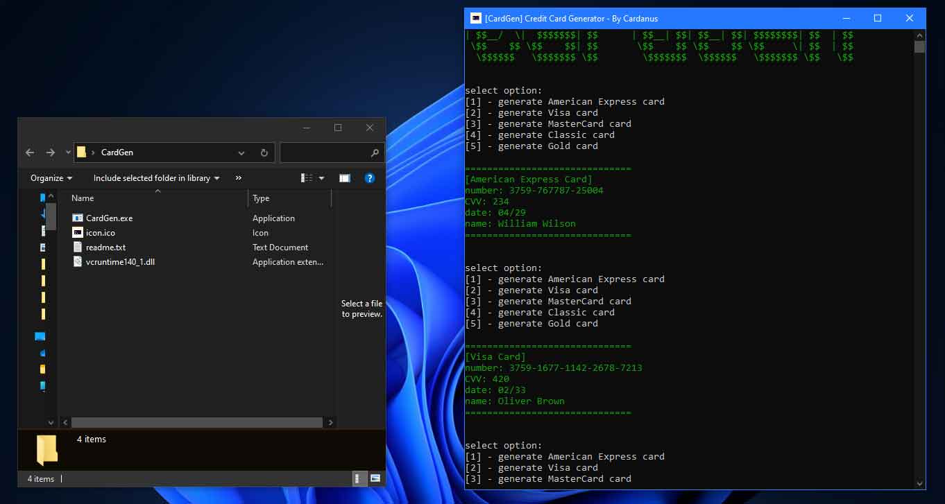 Credit Card Generator (CardGen)是一款信用卡生成器,用于生成 Visa、MasterCard、American Express 等信用卡的程序,主要用于创建模仿真实信用卡号格式的假信用卡号。这些号码通常用于测试目的,例如验证需要输入信用卡但不涉及真实金融交易的电子商务网站或软件应用程序的功能。生成卡的数据取自私人和公共数据库,这些数据库可以生成卡。因此,有机会从真实人的卡上获取数据,上面有余额。我手动测试,计算出发生这种情况的概率,大约每 100 张生成的卡中就有 1 张有余额(从 3 美元到 2400 美元)。