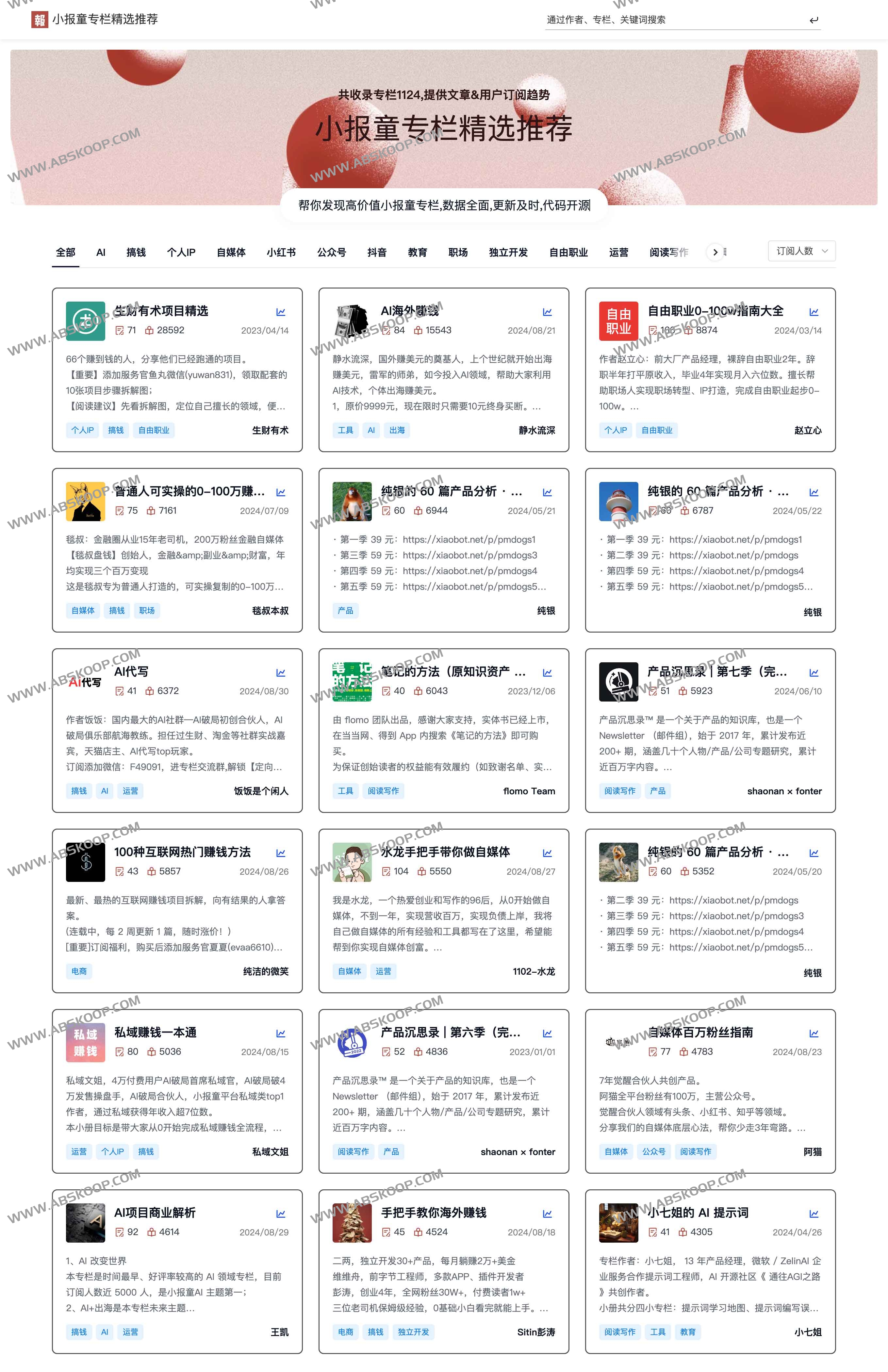 小报童专栏精选导航!小报童是一个汇聚优质付费内容的平台,小报童专栏导航站(xiaobots.com)精选最有价值的专栏资源,数据全面,更新及时,代码开源,共收录专栏 1124 个,帮助你快速访问、探索和发现最受欢迎的赚钱方法论、自我成长、自媒体变现、出海经验、社区运营、AI副业、产品经验和文案写作等精彩内容。立即访问,开启你的知识之旅!