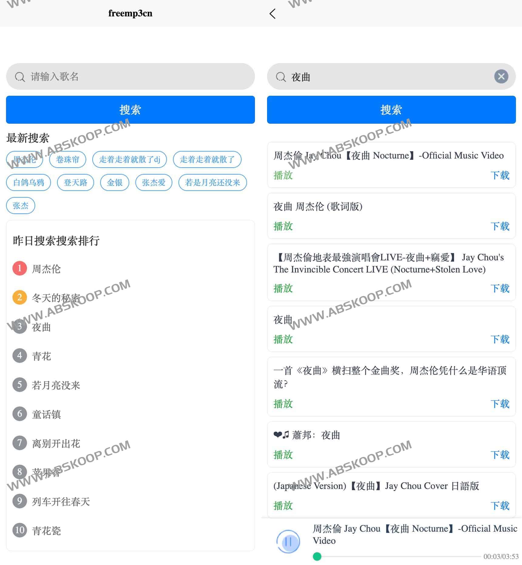 freemp3cn是一个免费音乐在线播放和音乐下载网站,可以让我们大家免费在线听想听的音乐网站,支持手机端电脑端直接在线搜索歌曲进行播放,并且支持音乐下载到本地播放,免注册登陆使用。