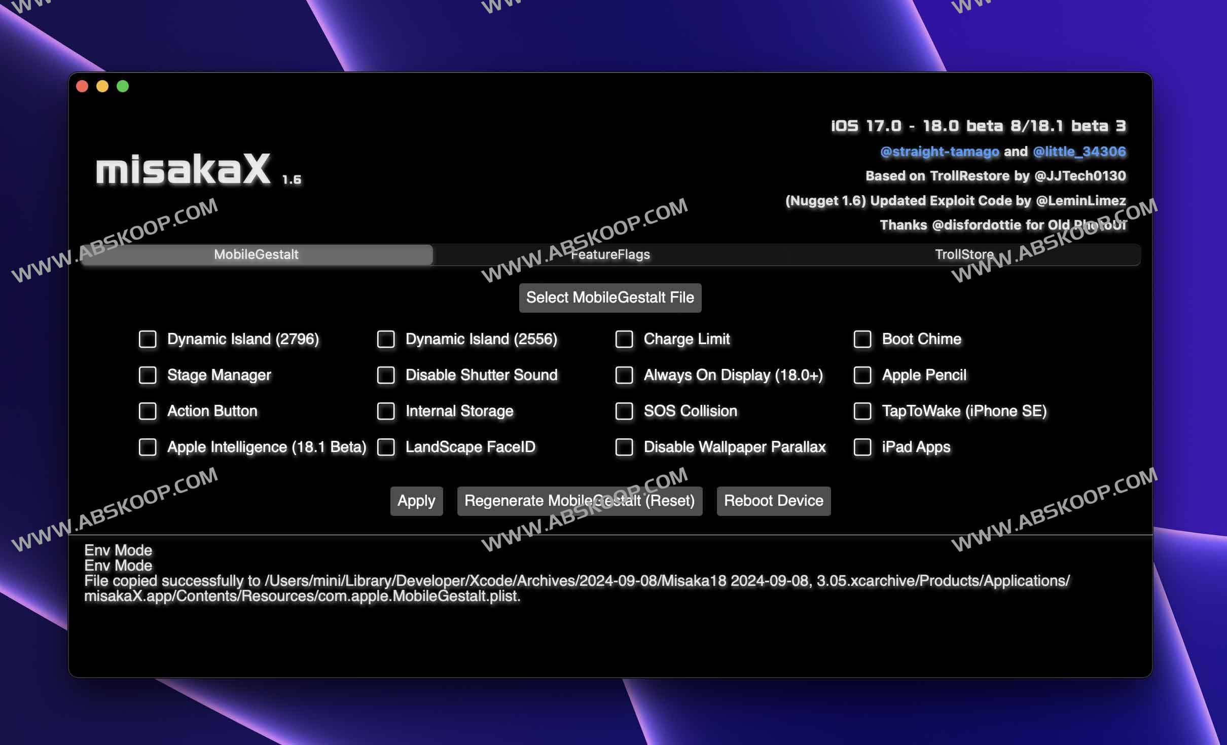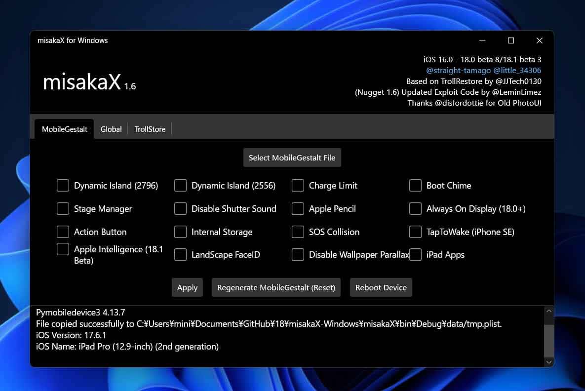 misakaX是一个ios性化定制工具,可以帮助你调整灵动岛、充电限制、开机铃声、快门声音等等,而且还可以让国行版本iOS设备开启Apple Intelligence功能,支持macOS和Windows设备,工具由详细的操作教程步骤,喜欢折腾利用misakiX 开启国行 iPhone 15 Pro AI 功能的同学可以试试,使用前记得备份设备数据。