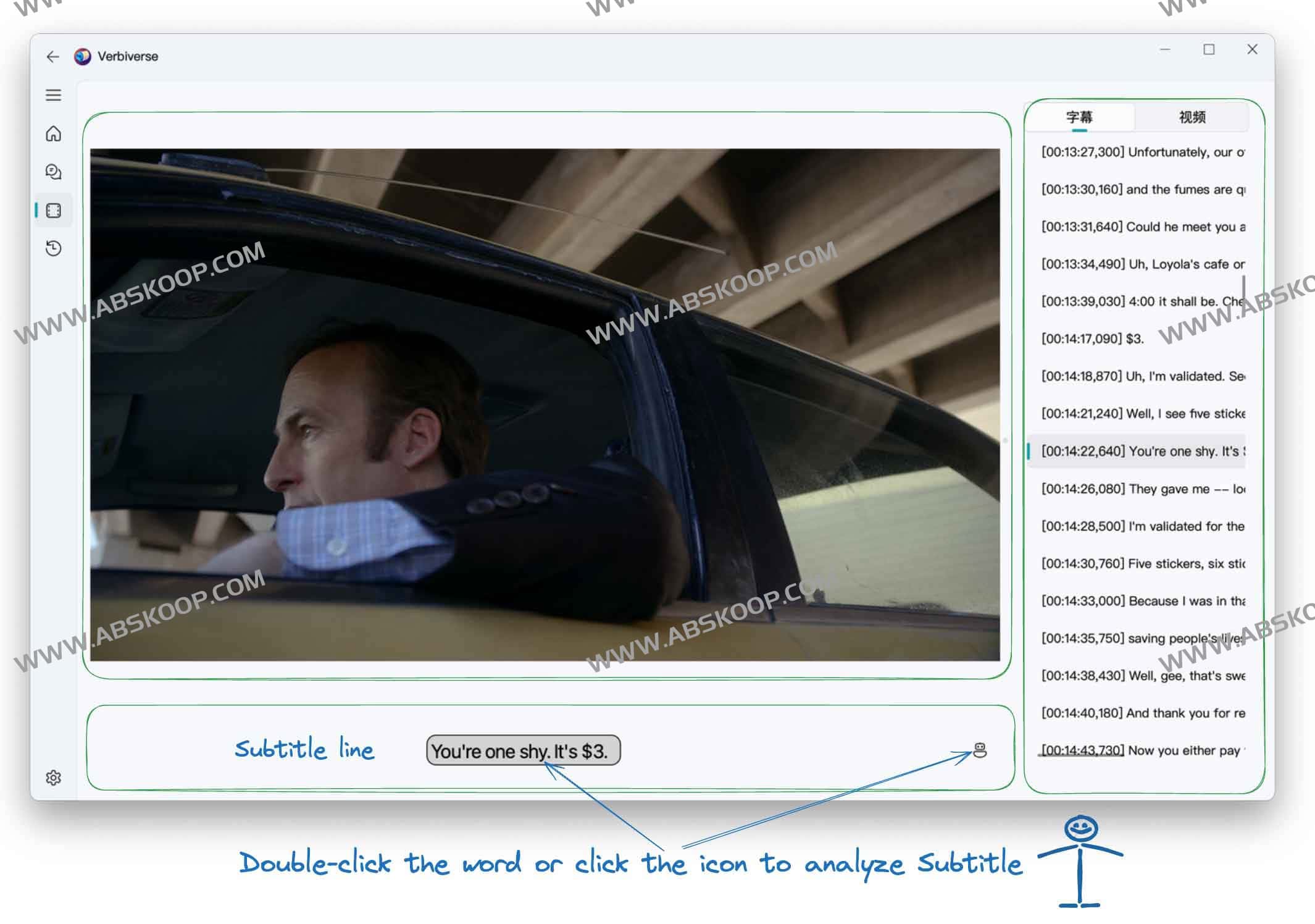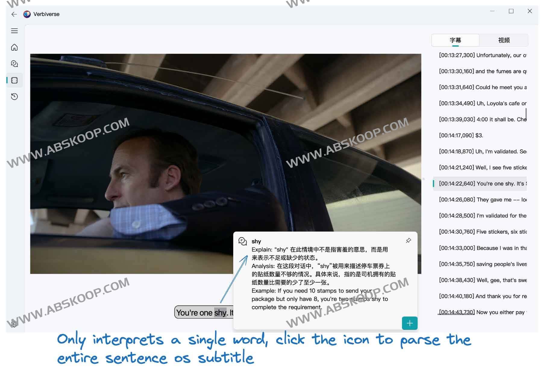 观看视频: 在视频播放模式下,工具会自动加载同目录的字幕文件。用户可以双击字幕中的单词或点击解析按钮,获得词汇或整句的解释。