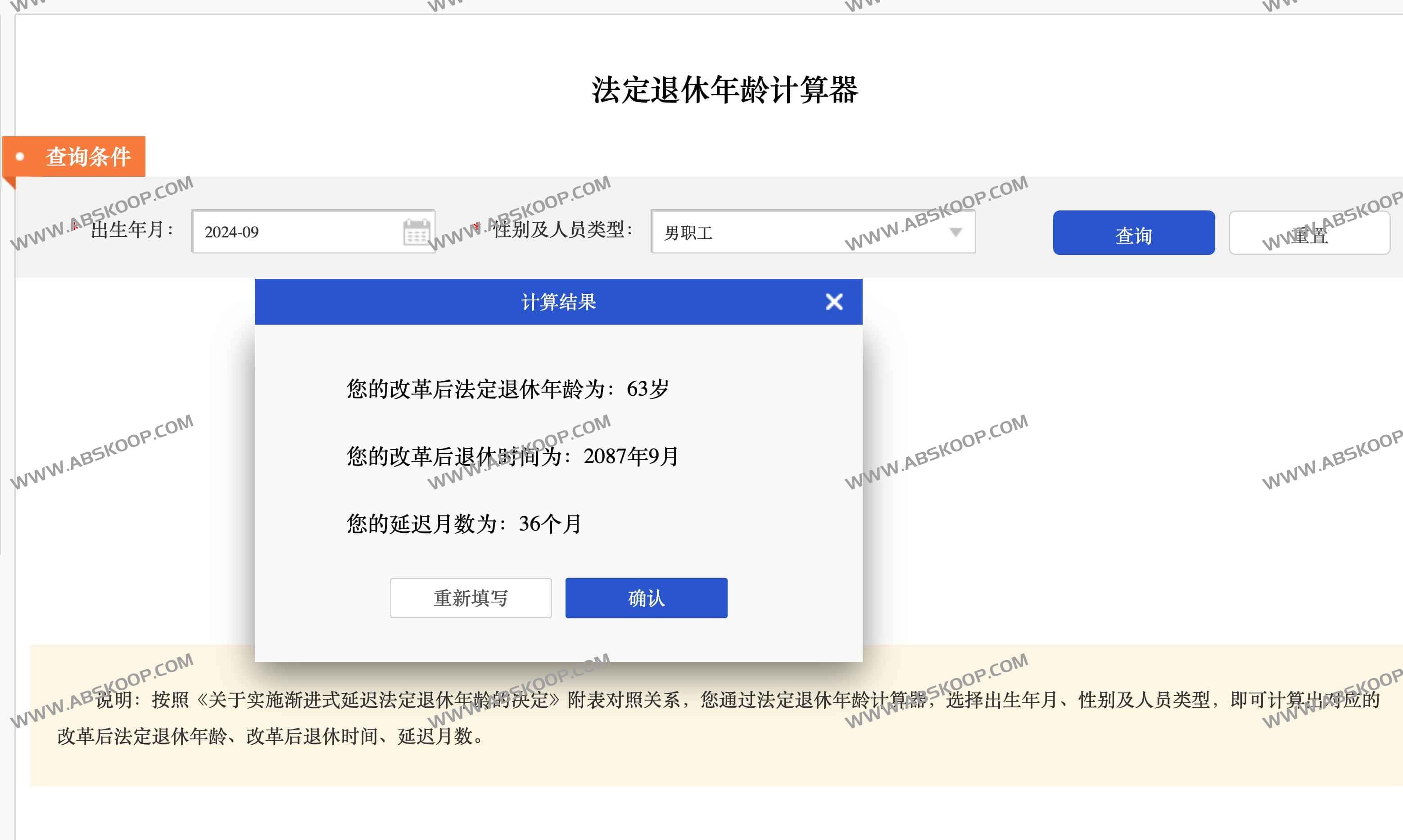 法定退休年龄计算器是一款由国家社会保险公共服务平台推出的在线法定退休年龄计算器,按照《关于实施渐进式延迟法定退休年龄的决定》附表对照关系,可以通过法定退休年龄计算器,选择出生年月、性别及人员类型,即可计算出对应的改革后法定退休年龄、改革后退休时间、延迟月数。