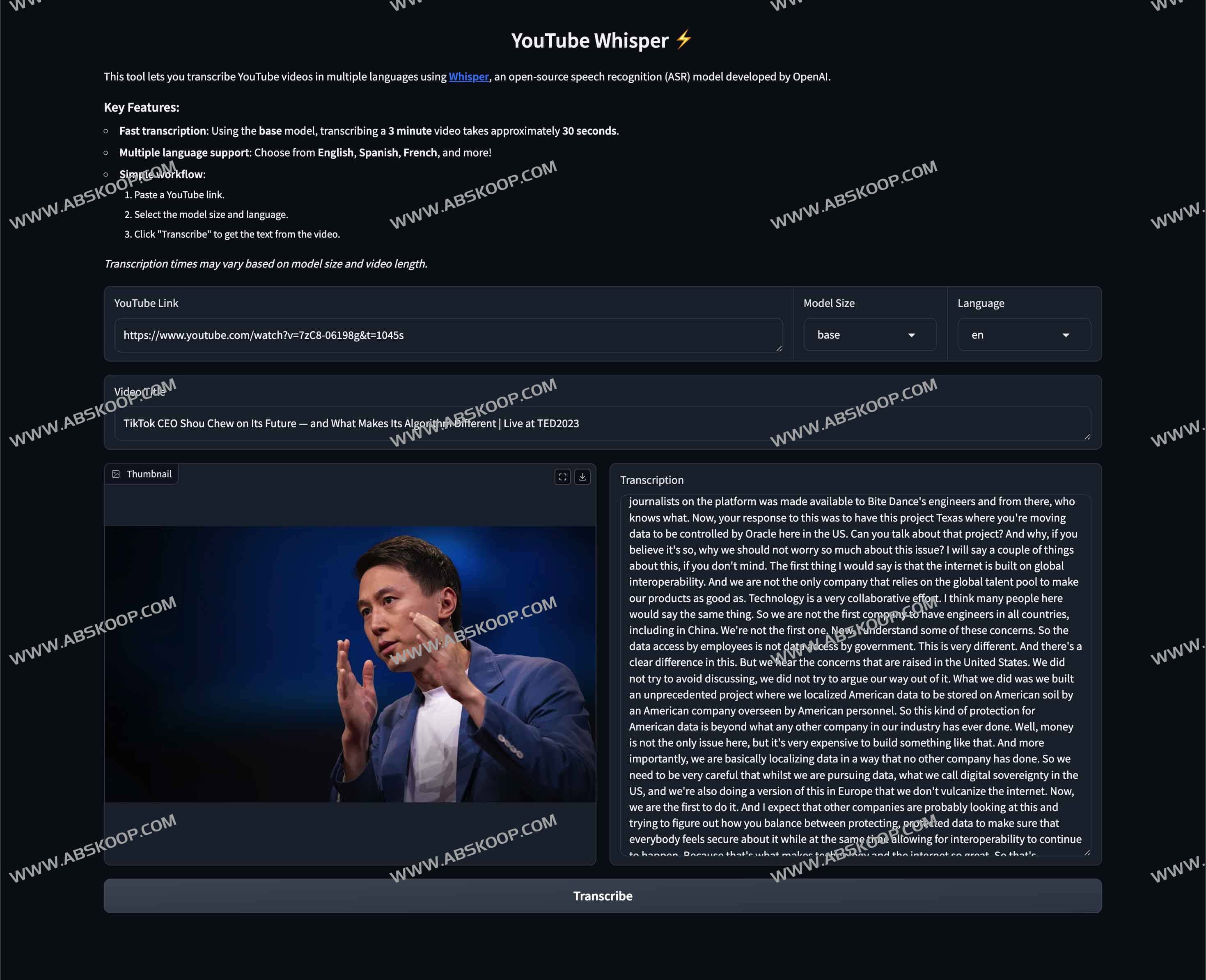 Youtube-Whisper 是一款基于 Gradio 的视频转文字工具,专门用于将 YouTube 视频或播放列表中的内容转录为高质量的文本,通过 OpenAI 的 Whisper 模型将 YouTube 视频转录为文本,支持多语言转录。用户只需粘贴 YouTube 链接即可完成音频提取和文字转录。其主要特点包括快速转录(3分钟视频约30秒完成)、多语言支持(如英语、西班牙语、法语等)以及简单的操作流程,用户可选择模型尺寸和语言后点击“转录”获取文本,转录时间会因模型大小和视频长度有所不同。