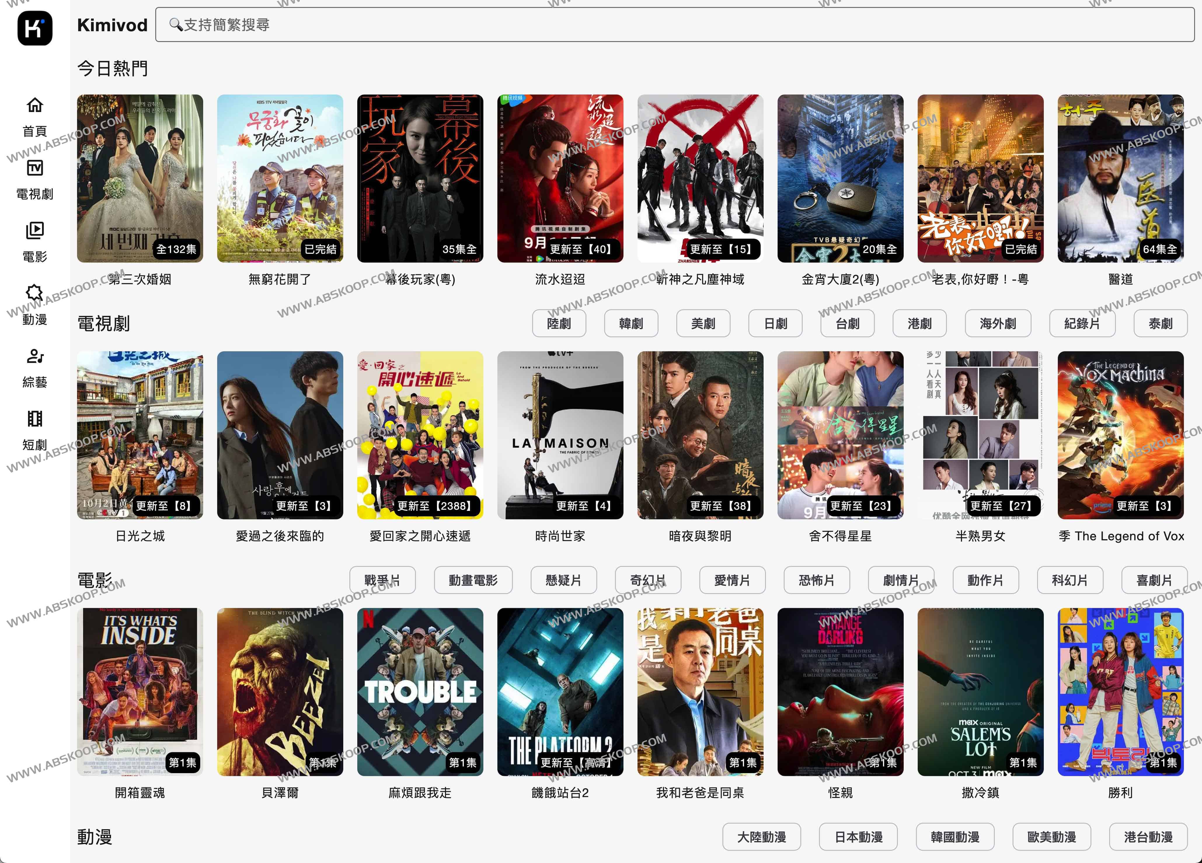 Kimivod是一个免费在线高清影视网站,涵盖电影、电视剧、动漫、综艺、陆剧、韩剧、美剧、台剧、日剧、BL、泰剧、纪录片等影视节目,免注册登陆即可在线观看,而且网站简洁无广告,且影视资源每天更新,片库资源也非常丰富。