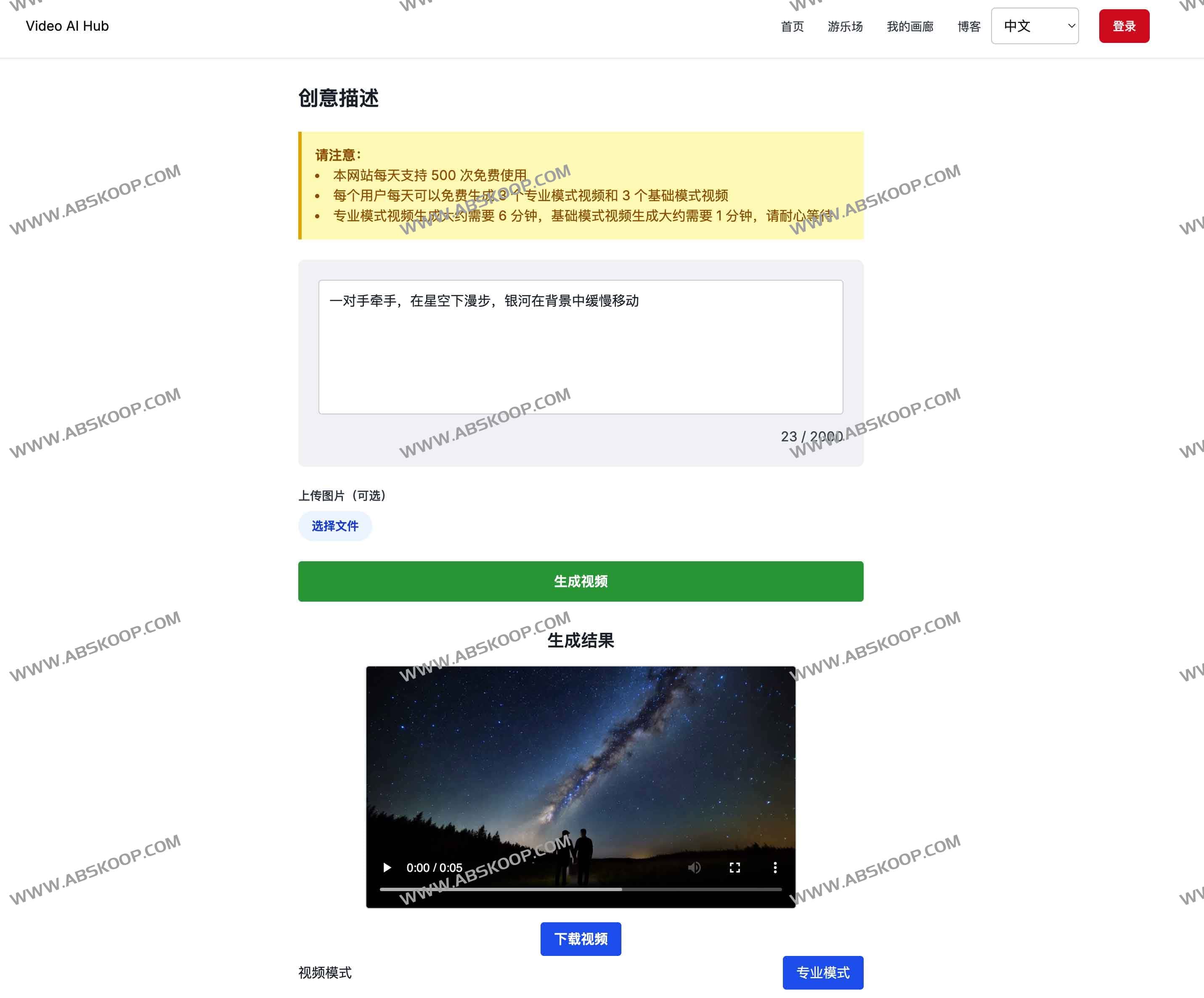 Video AI Hub是一个在线一站式 AI 视频生成信息和工具平台,使用人工智能从文本、图像或其他输入数据自动生成视频的过程。用户可以输入描述性提示,并使用像极小极大 AI 或露玛 AI 这样的平台生成高质量视频。这项技术极大地提高了视频创作效率,适用于广告、电影、动画等领域。而且网站免注册即可使用,网站每天支持 500 次免费使用,每个用户每天可以免费生成 3 个专业模式视频和 3 个基础模式视频,专业模式视频生成大约需要 6 分钟,基础模式视频生成大约需要 1 分钟,请耐心等待,感兴趣的同学可以体验。