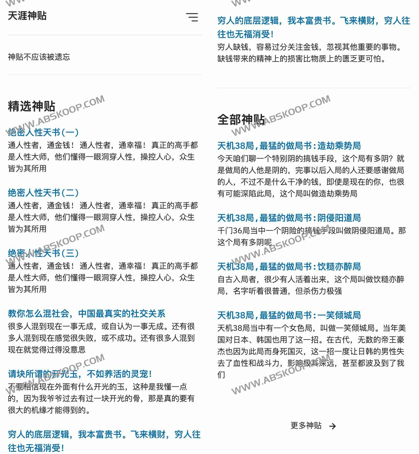 天涯神贴是一个天涯神贴合集在线版网站,网站收录了一些天涯神贴资源,例如天机38局、必读神贴等等经典的天涯神贴资源,直接在线阅读,无需下载天涯神贴pdf资源即可在线阅读学习天涯神贴资源,天涯神贴不应该被遗忘。