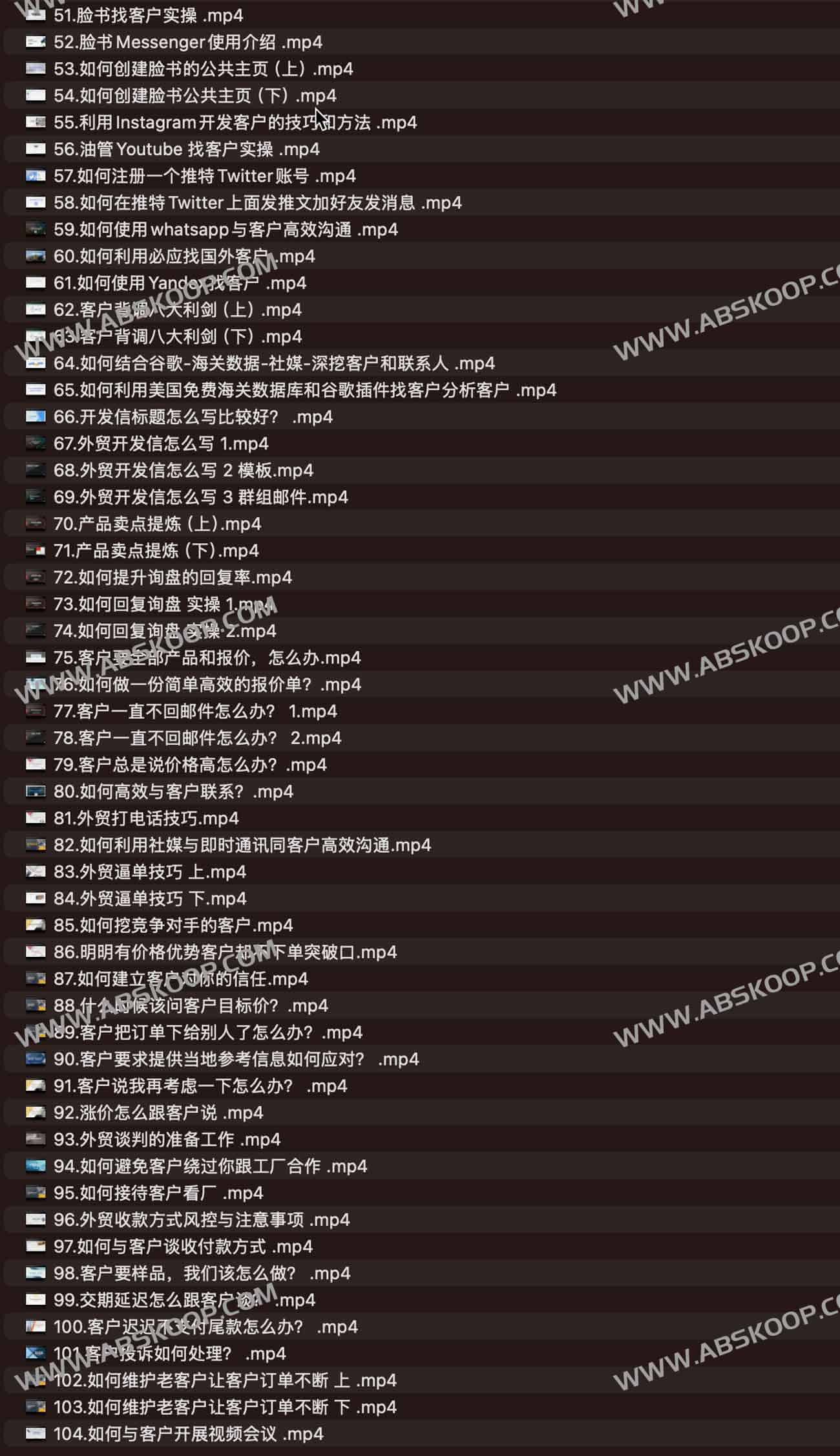 课程来自凤姐的外贸进阶课(扩客,社媒,沟通,谈判技巧)。帮助你了解如何快速入行做外贸,工厂老板可以扩展公司外贸部门,外贸管理层掌握培训新人的秘诀,节省时间,外贸业务学习外贸客户沟通谈判新技巧。