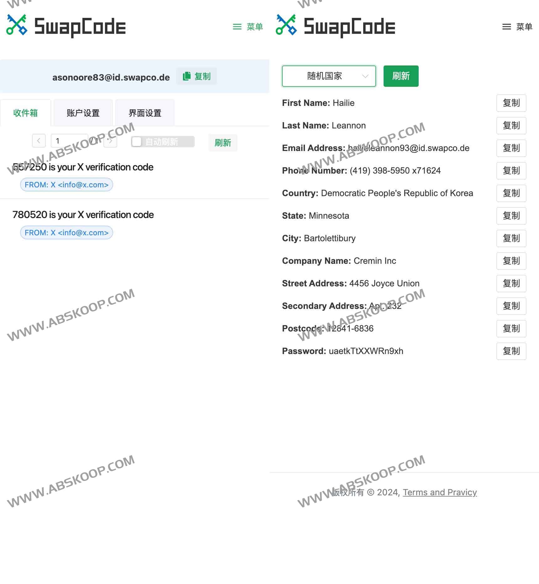 SwapCode是一个在线临时邮箱和虚拟信息生成器,可以用来注册推特/Twitter/X等等社交平台帐号,还支持虚拟信息生成,支持包括美国虚拟信息生成、日本虚拟信息生成、法国虚拟信息生成、中国虚拟信息生成、德国虚拟信息生成等等,虚拟信息包括姓名邮件、电话、国家地址密码等等信息,用来注册不重要的帐号保护隐私比较好。