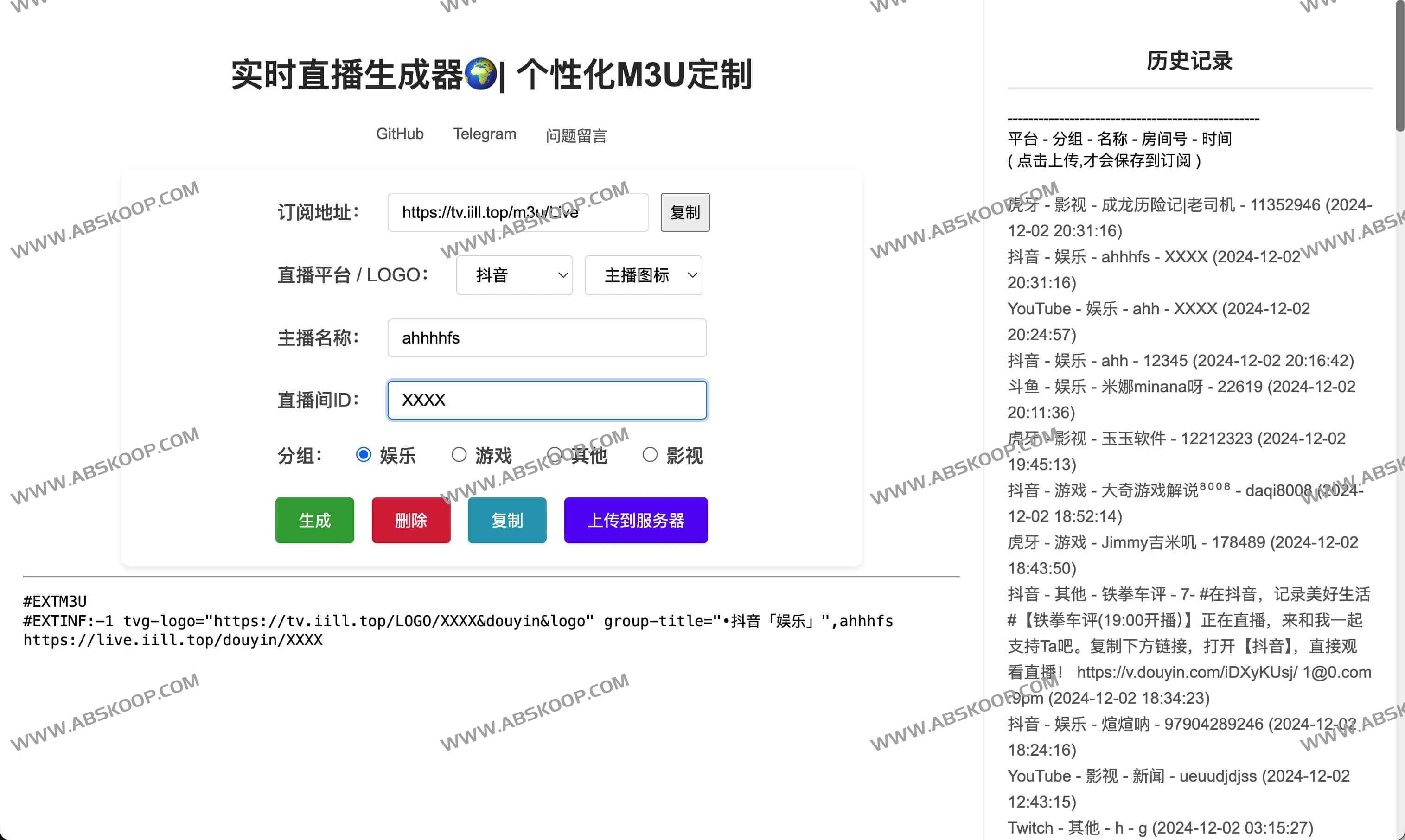 iill top是一个实时直播生成器 个性化M3U定制工具,支持YouTube、Twitch、抖音、虎牙、斗鱼、b站等等平台,直接填写对应参数即可。
