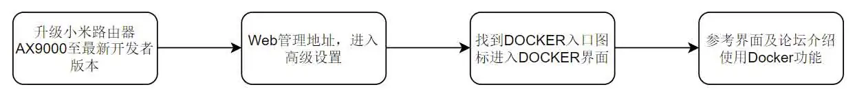 一. 操作指导 第一步:登录小米路由器官网下载小米路由器AX9000最新的开发者版本,并升级路由器至开发者版本(如已升级,忽略此步骤) http://www1.miwifi.com/miwifi_download.html 第二步:进入开发者版本管理后台(默认为192.168.31.1或miwifi.com),在高级设置中找到DOCKER功能