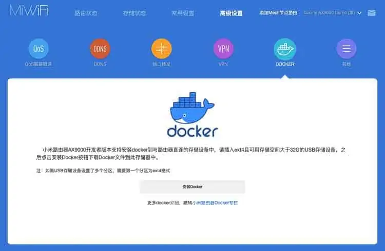 小米路由器AX9000开发者版本支持Docker功能,可从小米路由器官网下载1.0.140版本或以上的AX9000开发者固件开启体验!