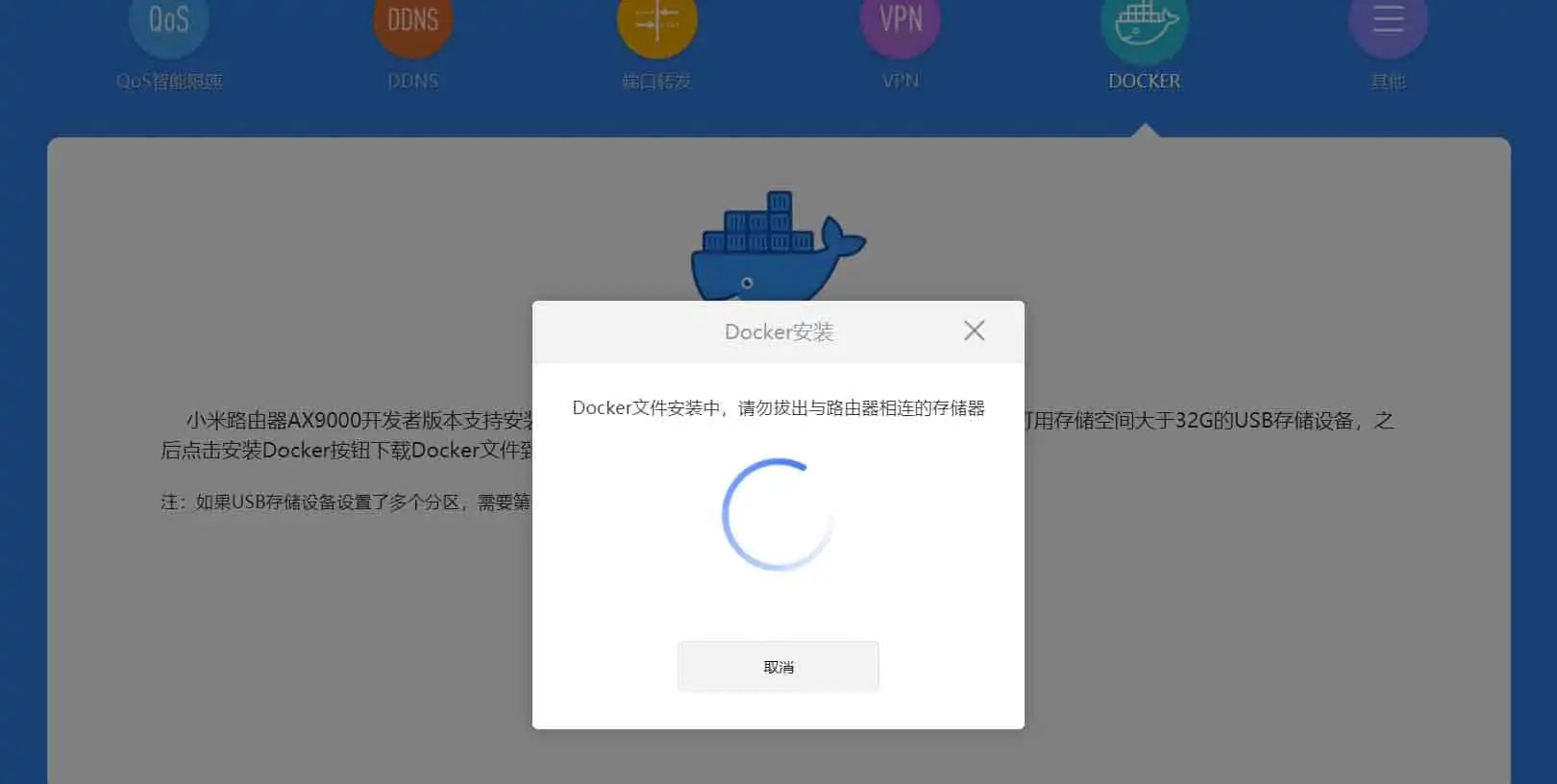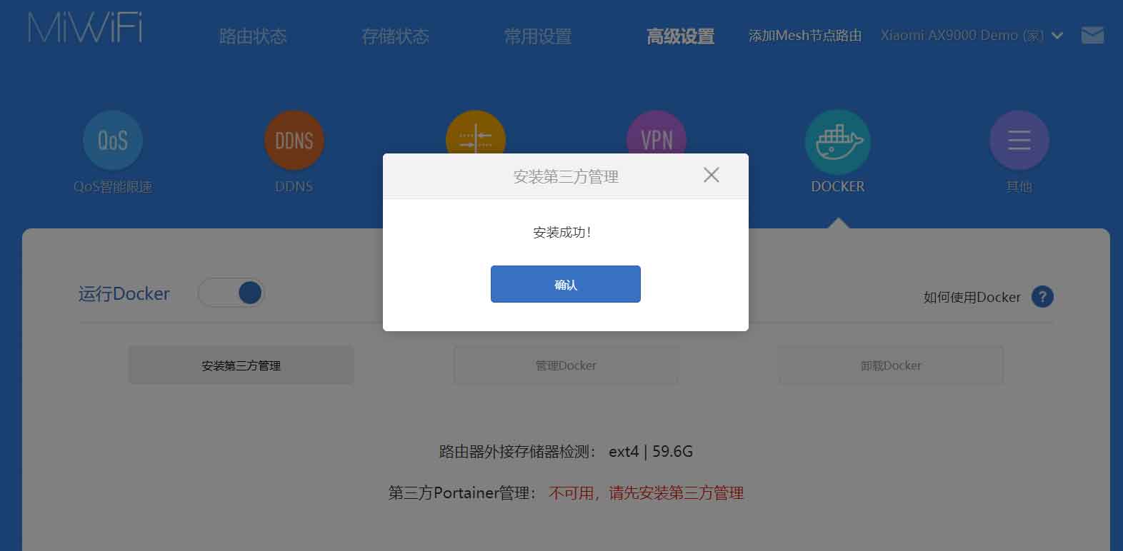 第三步:插入ext4格式且剩余存储空间大于32G的USB存储设备到小米路由器AX9000 USB口,单击“安装Docker”按钮,安装Docker套件直至提示安装成功
