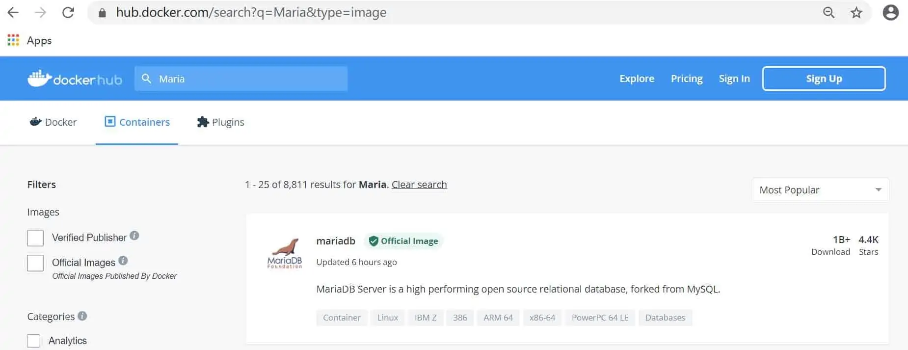 例如搜索关键词”mariadb“,搜索到Mariadb官方镜像