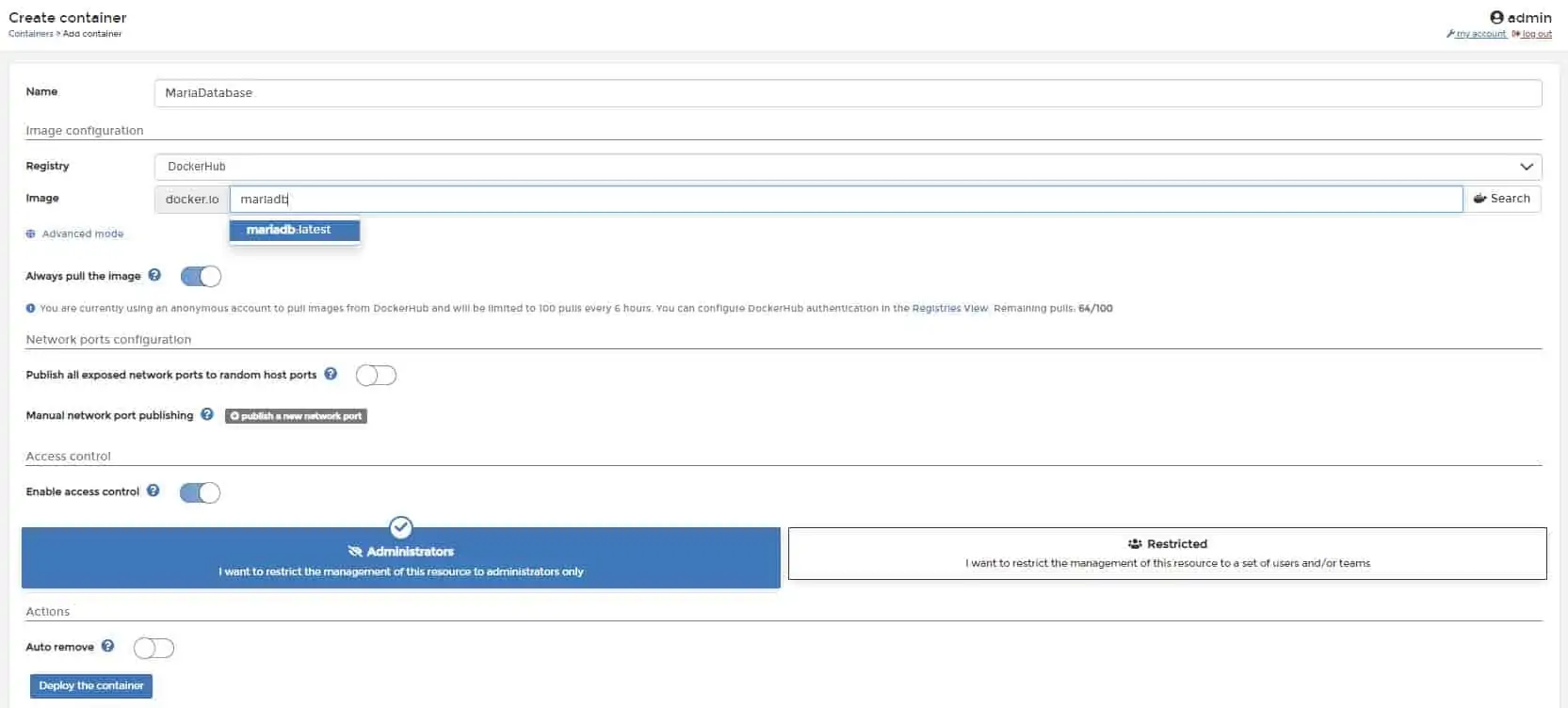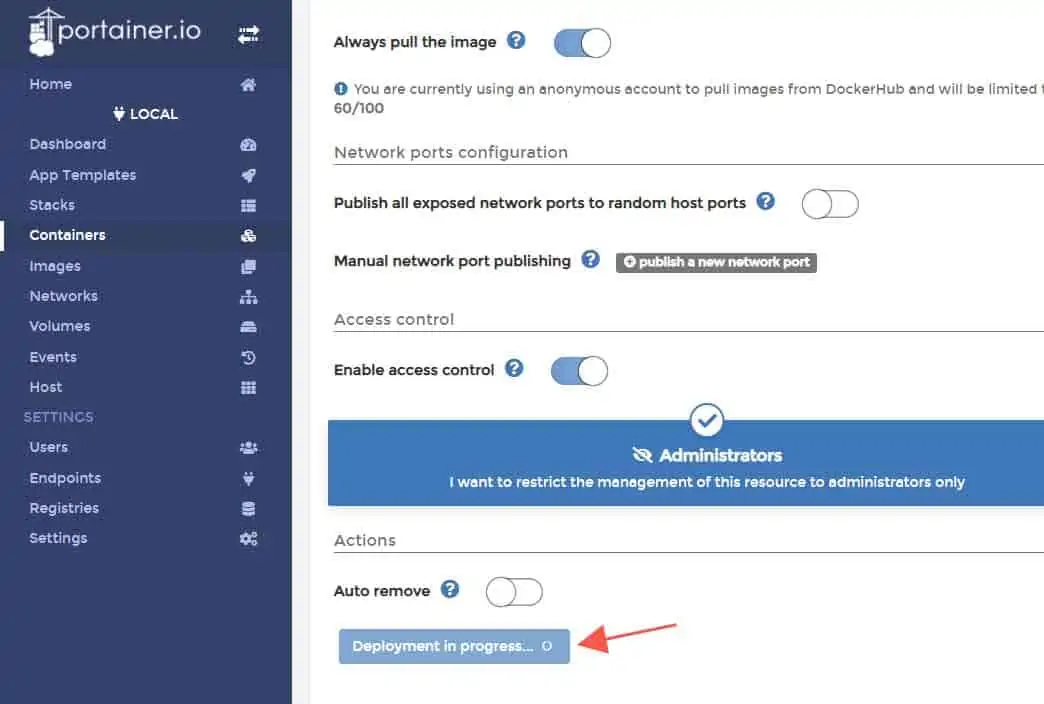 如果是再次创建的情况,按默认提示点选填充了latest后缀的镜像 单击”Deploy the container”部署镜像在容器中