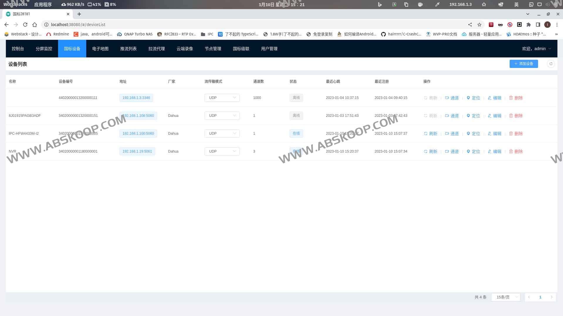 WVP-PRO (Web Video Platform) 是一个基于 GB/T28181-2016 标准实现的开箱即用的网络视频平台,兼容 GB/T28181-2011,支持国内外主流视频设备(如海康、大华、宇视的 IPC、NVR 等)和非国标设备(如 ONVIF、RTSP、RTMP 设备)接入。其功能涵盖 NAT 穿透、多平台级联、视频预览、云台控制、录像回放、报警处理、语音对讲等,支持多种视频流格式的分发和推送。平台具备良好的兼容性和扩展性,支持电子地图展示、负载均衡、云端录像、跨域部署等,广泛应用于浏览器视频播放、跨网视频互联、国标设备对接等场景。完全开源,采用 MIT 协议,支持商用,同时提供进阶功能和 ONVIF 接入服务。