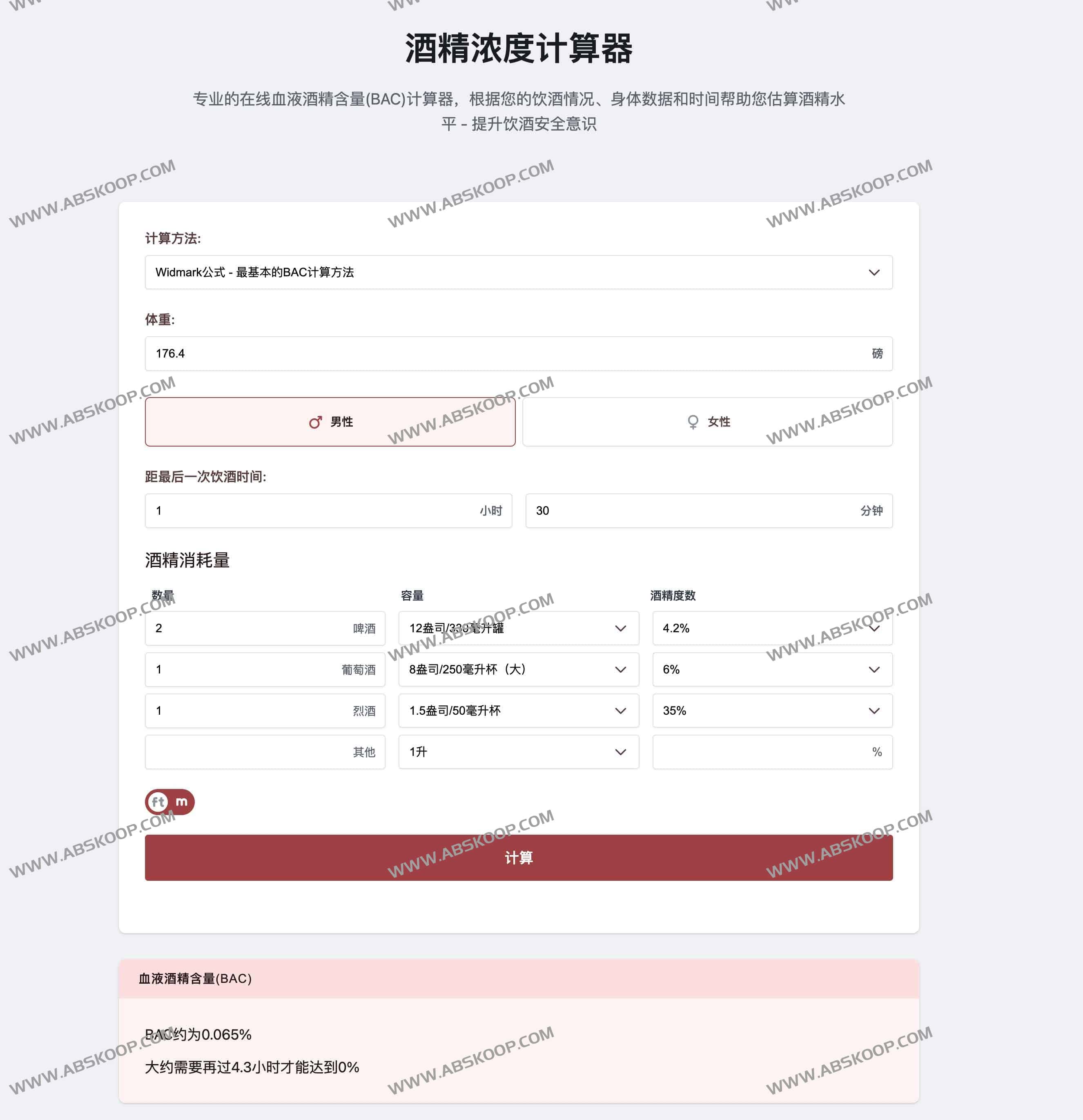 酒精浓度计算器是一款专业在线血液酒精含量计算工具,通过输入个人信息和饮酒数据,利用国际认可的公式(如Widmark、Watson、Seidl和NHTSA)计算血液酒精含量(BAC)。该工具可帮助用户了解饮酒对身体的即时影响,提供健康饮酒建议,并评估驾驶安全性。它操作简便,支持个性化计算,适用于普通用户和专业人士,如健康顾问和法律从业者,是健康生活和安全决策的有力支持工具。