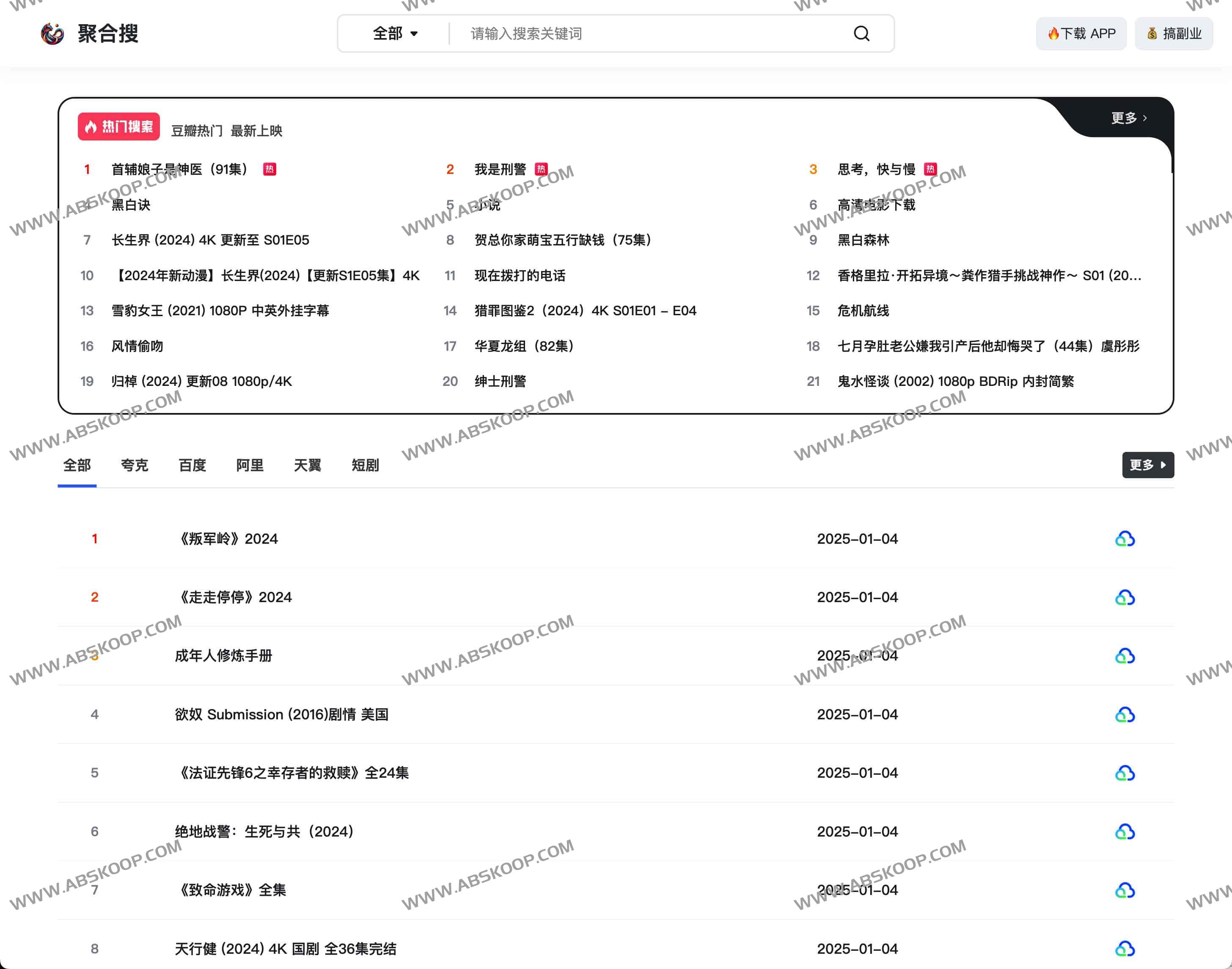 聚合搜是一个在线全类型聚合网盘搜索引擎,支持阿里云盘、百度网盘、夸克网盘、迅雷云盘等主流网盘资源搜索,涵盖电影、电视剧、短剧、动漫、软件、音乐、文档、壁纸、学习资源等全类型资源,给你最好的网盘搜索体验。