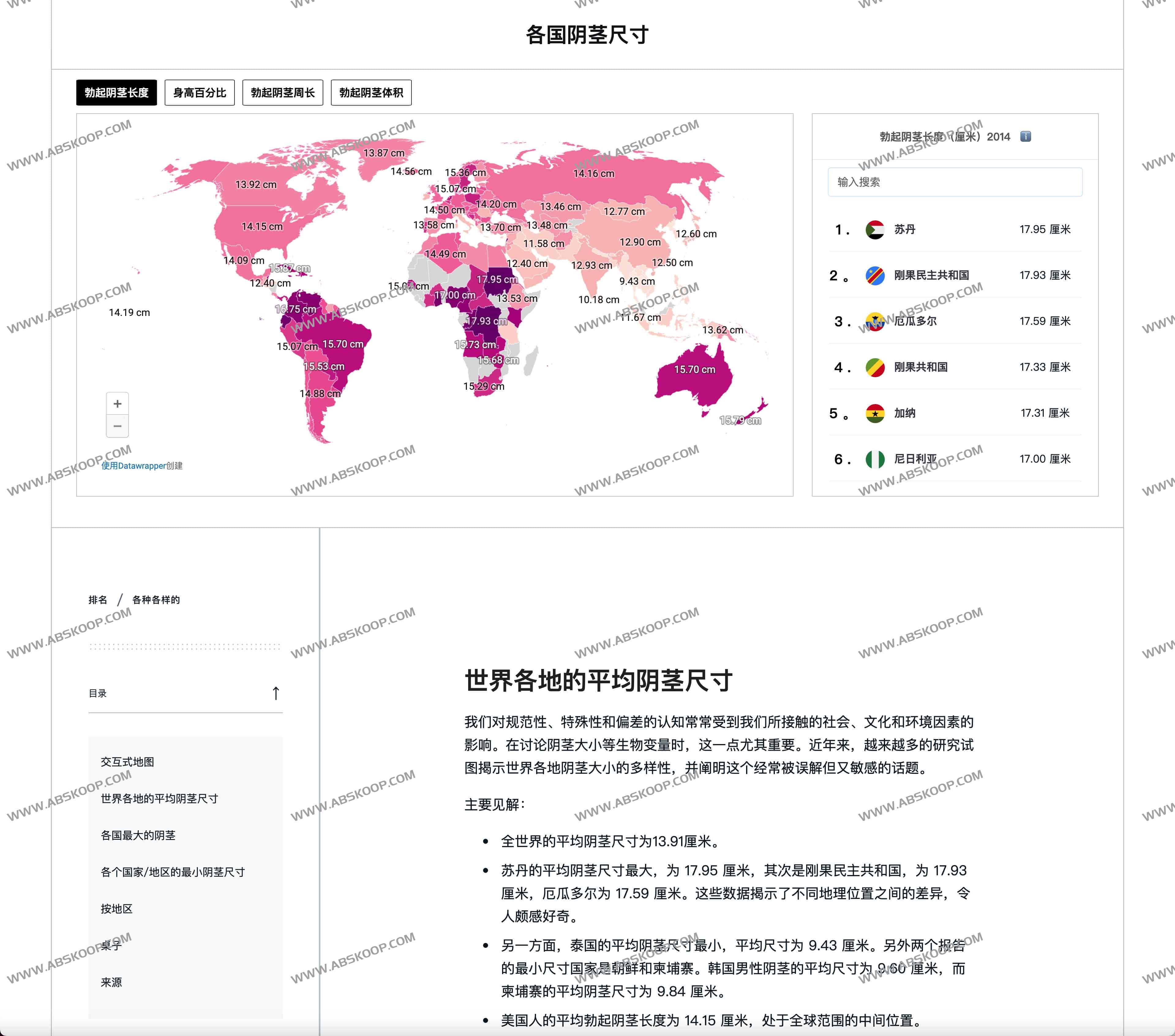 一份由Data Pandas发布的全球各国男同学DD玩具尺寸大小数据,包含DD的长度、周长、体积等等数据,可以按照国家交互式地图、地区等等方式来筛选查看,感兴趣的同学可以到网站学习研究。