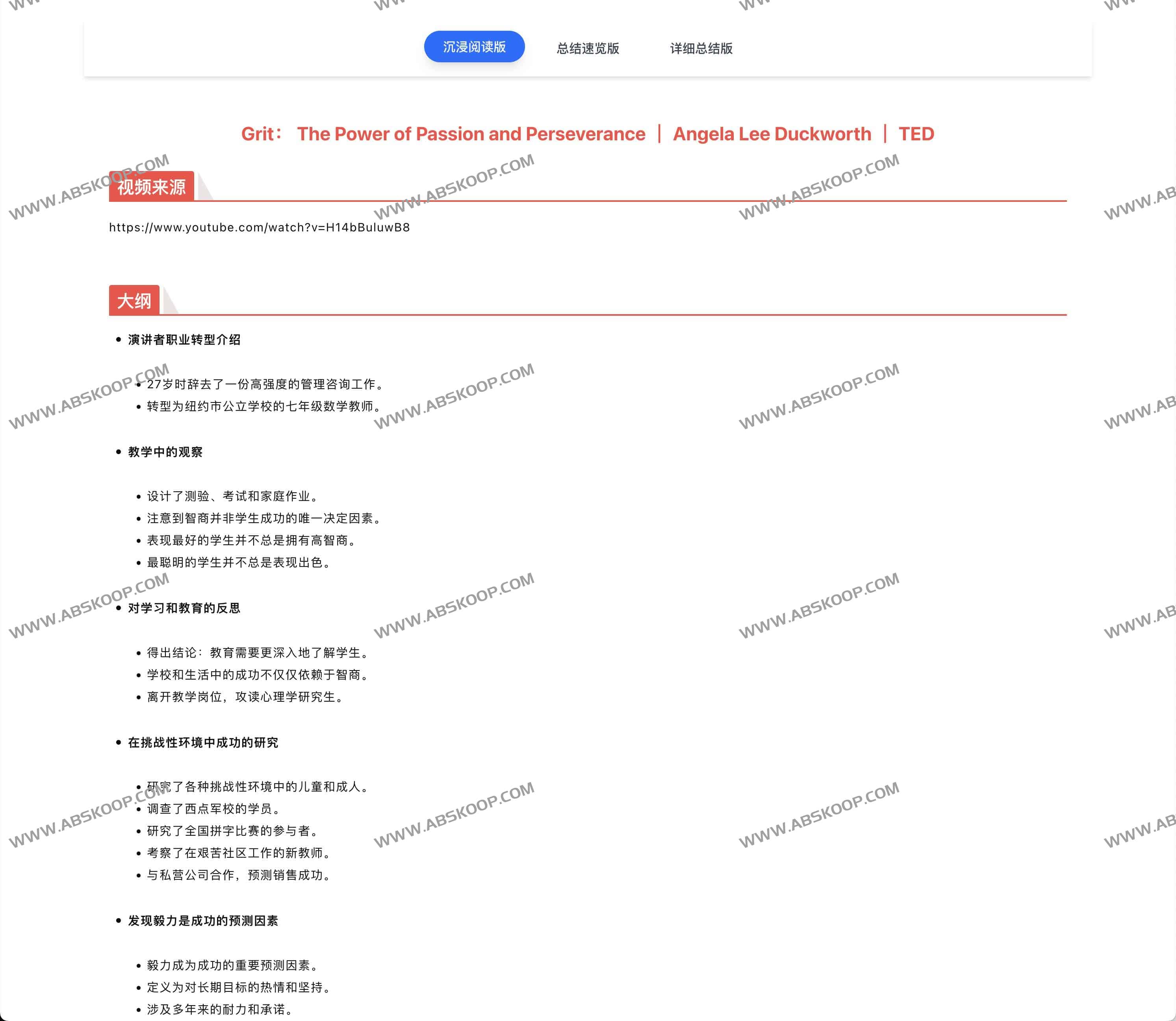 - 思维导图及分析:提供全文和分章节两种维度的内容总结。全文总结包含结构化大纲、思维导图、核心观点提炼和关键词汇提取。章节总结则配备关键画面截图、精选问答和深度思考点,帮助您更好地理解和消化内容。