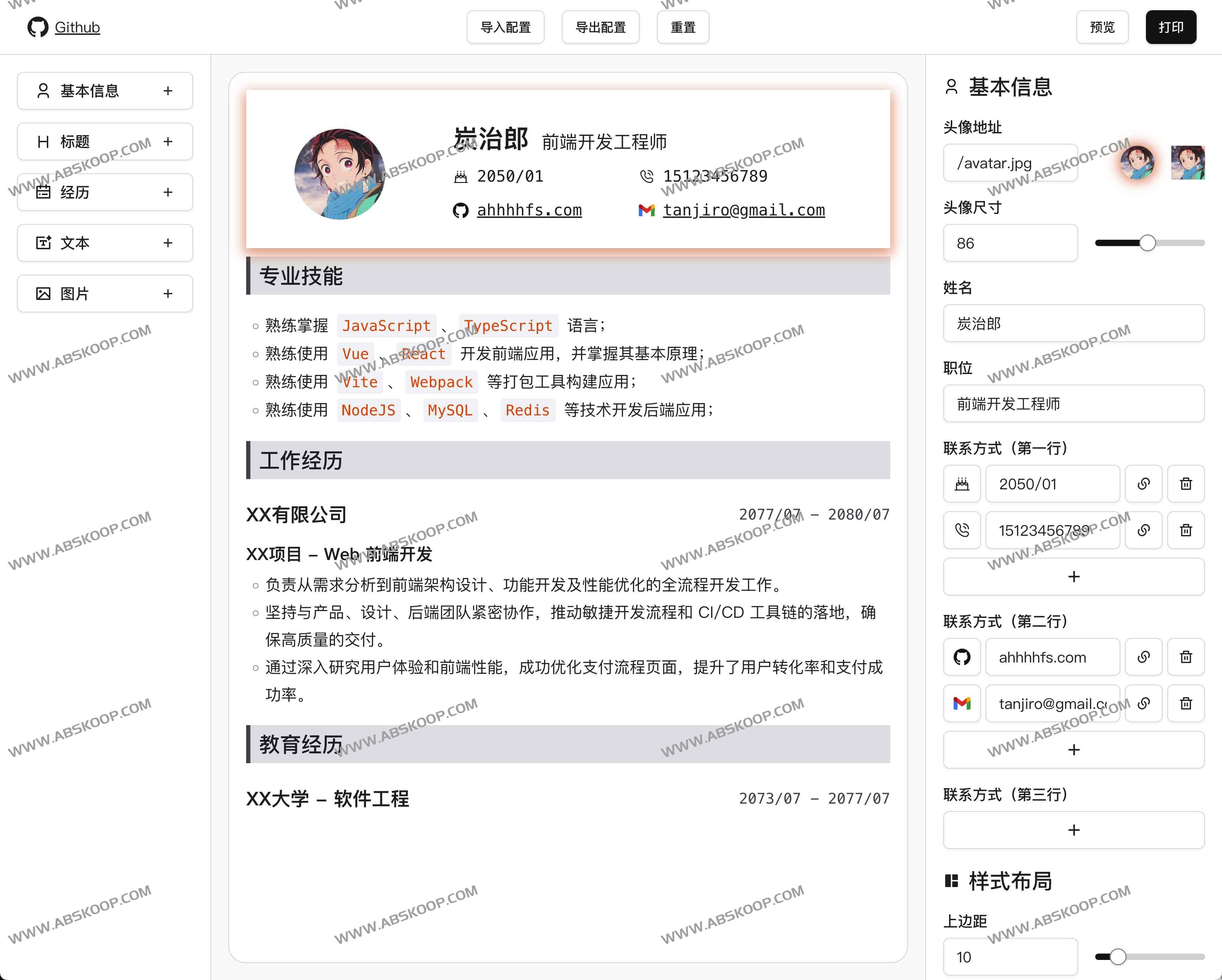 dnd-resume是一款实用的在线简历生成工具,提供在线预览和PDF导出功能,支持用户自定义头像、姓名、职位、联系方式以及样式布局等信息。通过该工具,用户可以快速创建专业简历,轻松展现个人职业形象。
