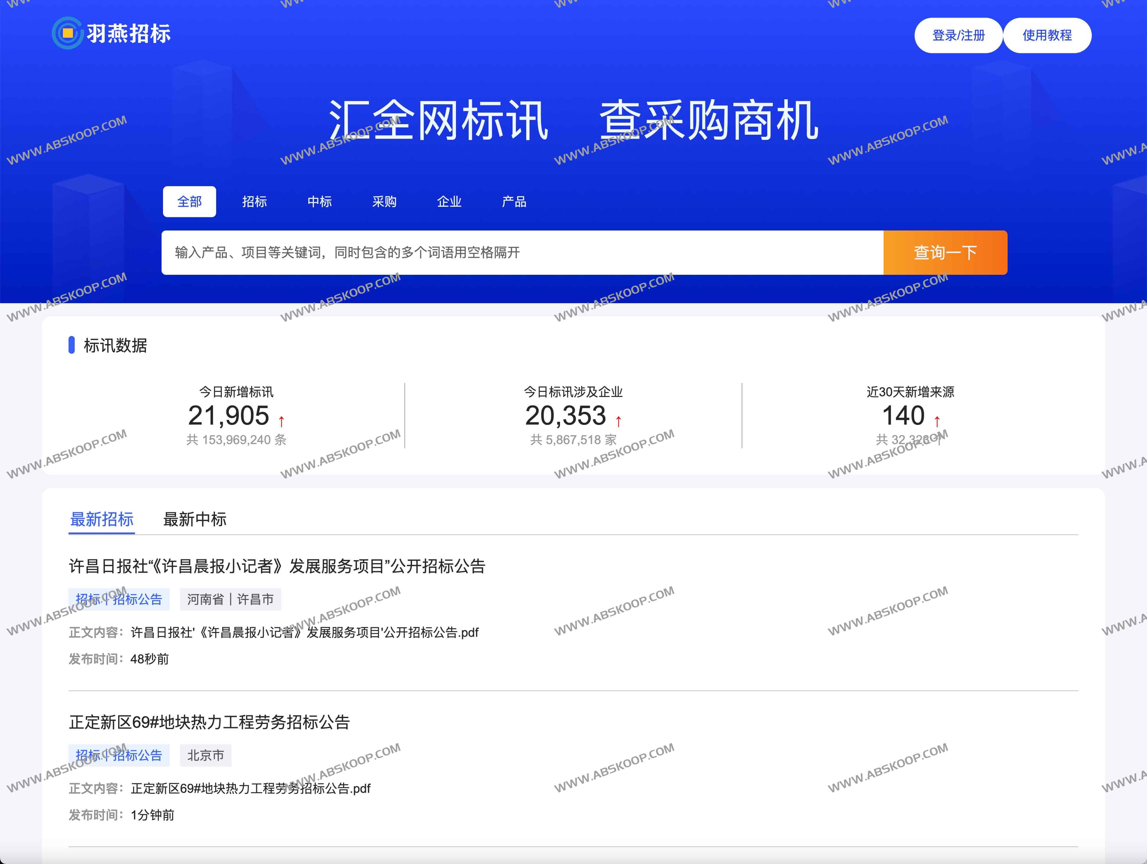 羽燕招标是一个免费提供全国招标信息的网站平台,覆盖全国的免费招标信息平台,每日更新超过2万条标讯,提供招标信息、中标公告和采购商机,涵盖各行业和地区,帮助用户高效获取政府采购及招投标相关资源。