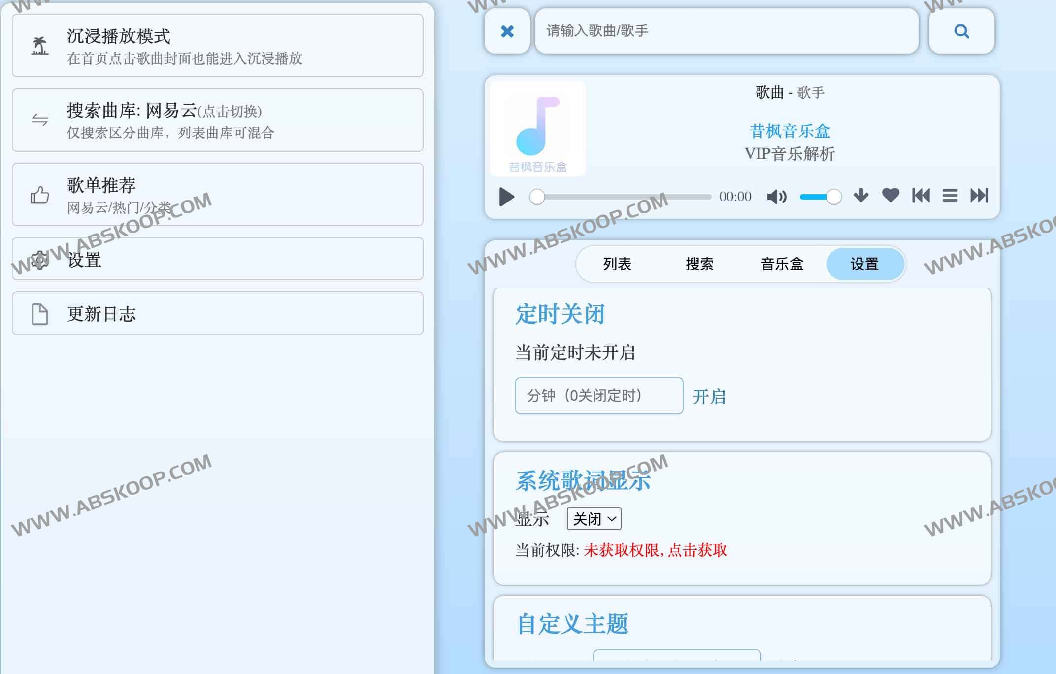 昔枫音乐盒是一款免费VIP音乐解析下载工具,可以解析下载V全网VIP音乐资源,直接输入歌名歌手名等搜索即可在线播放和下载音乐。