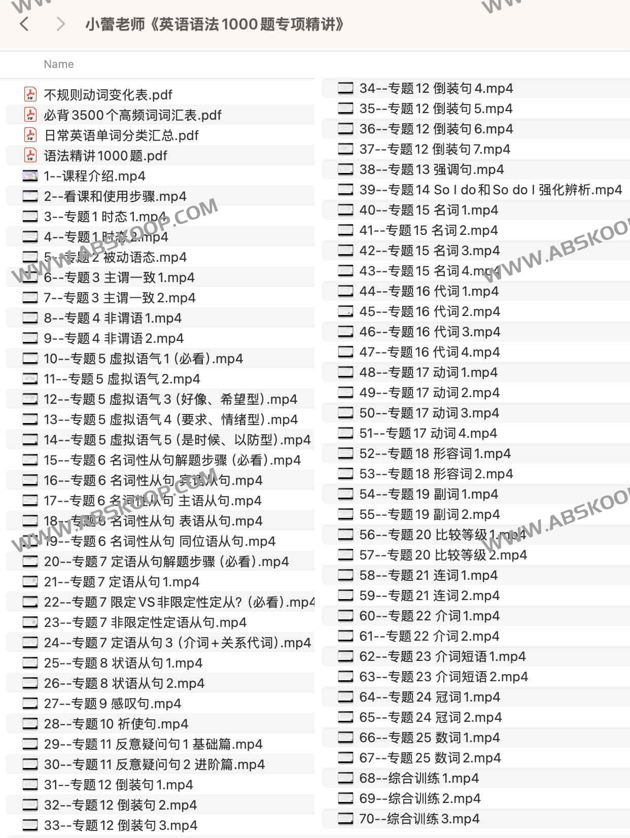 小蕾老师《英语语法1000题专项精讲》,一套系统的英语语法课程,涵盖 25 余个语法知识点,包括时态、语态、主谓一致、非谓语、虚拟语气等教学内容,夸克网盘课程。