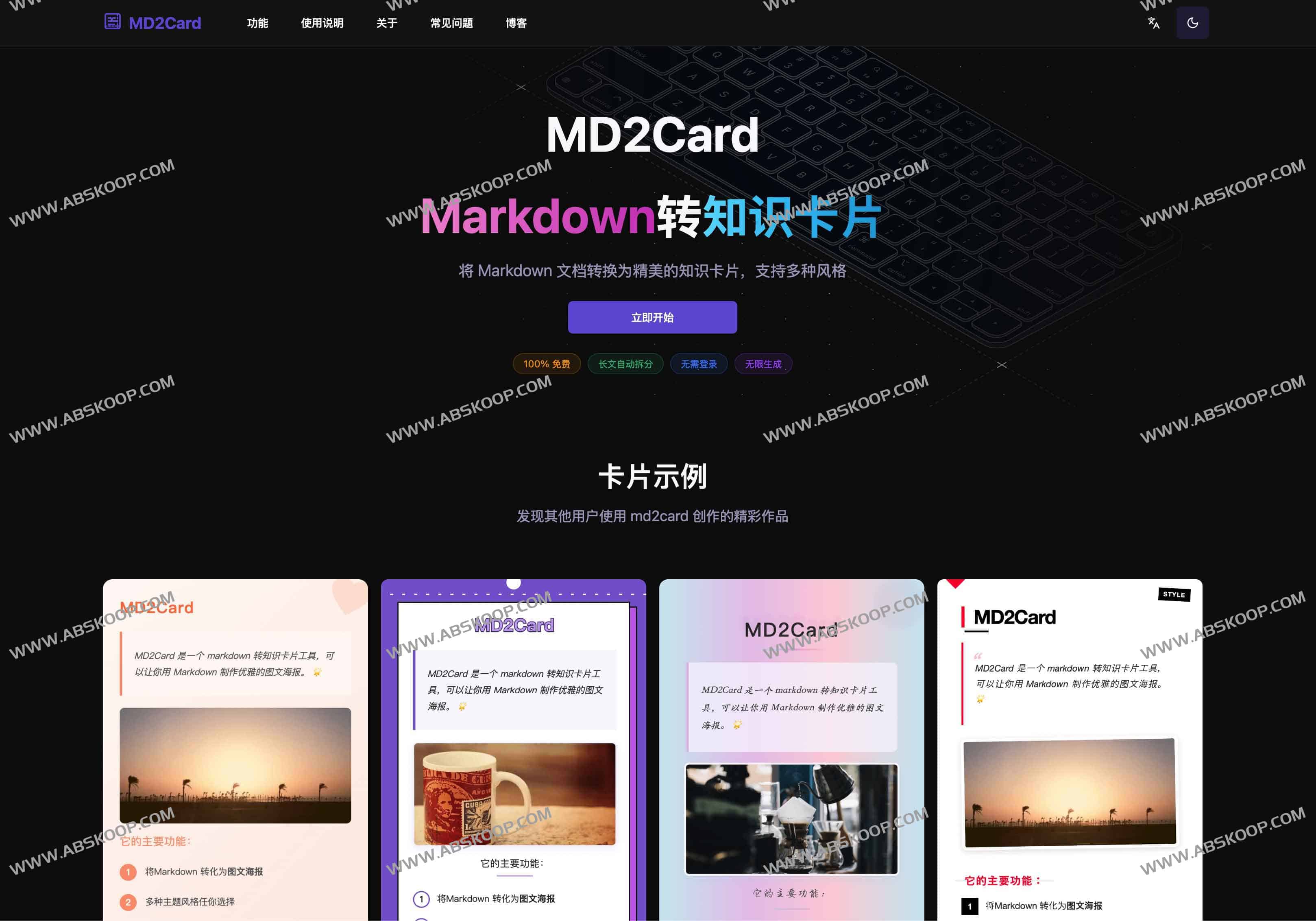 MD2Card 是一款免费的 Markdown 转知识卡片工具,帮助用户将 Markdown 文档转换成精美的知识卡片,让学习笔记、知识整理和内容分享变得轻松高效。它支持完整的 Markdown 语法,比如标题、列表、代码块、表格和引用等,在编辑器中可以实时预览并自动拆分长文,用户可以根据需求选择温暖柔和、简约高级灰、梦幻渐变或清新自然等多种风格,而响应式设计和暗色模式则满足不同设备的显示需求。整个工具操作简单,无需登录便可无限次生成,并且支持导出为图片或 SVG 格式,便于分享推广,完美契合社交媒体文案和小红书风格海报的需求,让创作者能够快速制作出视觉与内容兼备的知识卡片。