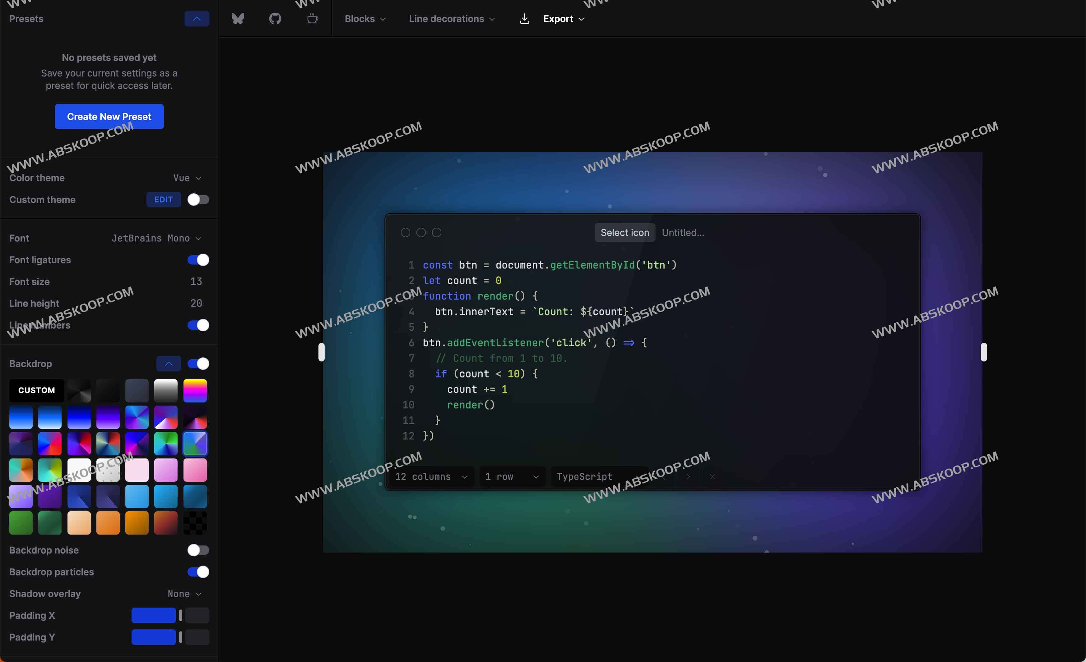 Chalkist是一款专为开发者设计的工具,可以将您的源代码转换成美观的图片,帮助提升代码展示效果。通过简洁直观的界面,用户可以自由选择颜色主题、字体和行高,定制出独具个性的代码截图,并支持添加行装饰以突出代码结构。该工具不仅允许导出高质量图像,还能保存自定义设置为预设,方便后续快速生成,适用于分享、展示和存档您的编程成果。