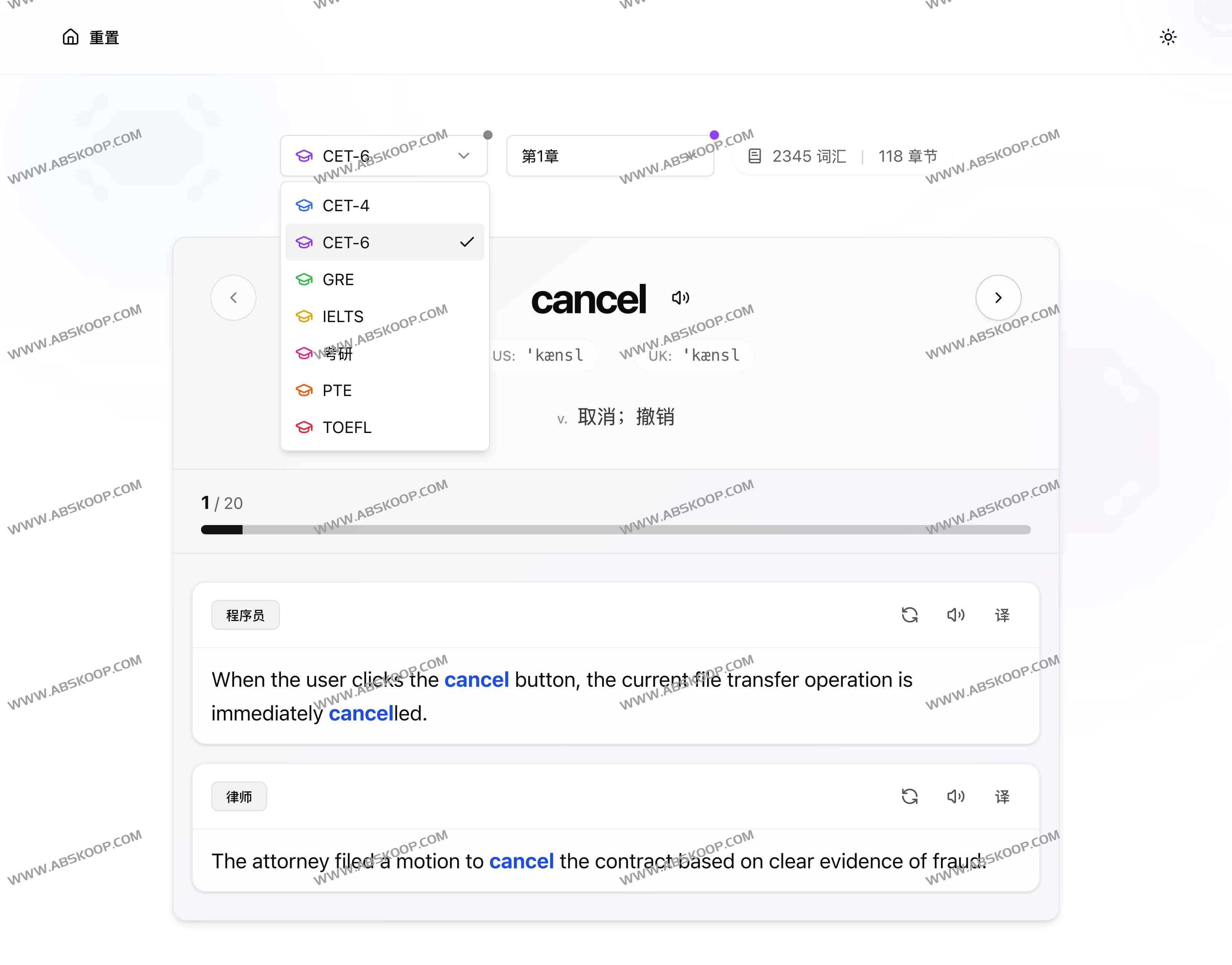 ProWords是一款基于人工智能的专业化英语学习平台,专为不同职业人群量身定制,通过先进的AI技术生成与用户职业背景贴合的英语例句,帮助提高单词记忆效率和实际应用能力。平台覆盖CET-4/6、GRE、TOEFL、IELTS、考研等丰富词库,支持用户自定义职业身份组合,生成多样化的例句以满足不同工作场景需求,同时具备进度自动保存和深色模式等便捷功能,且完全免费使用,无需注册,为学习者提供了一个高效、精准且有趣的英语学习新体验。