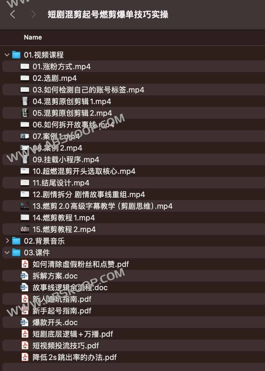 短剧混剪起号燃剪爆单技巧实操,夸克网盘课程。本课程提供短剧混剪全流程实操指导,涵盖涨粉方法、选剧技巧和账号标签检测;着重讲解原创剪辑、故事线拆分与重组、爆单开头设计和结尾制作。课程包含多阶段的视频教程与详细文档,传授燃剪2.0高级字幕教学、燃剪教程及背景音乐配置方案,并辅以实例分析和虚假粉丝清除策略。内容覆盖投流技巧及降低跳出率措施,助力新手在短剧混剪领域快速起号,实现销量爆单。