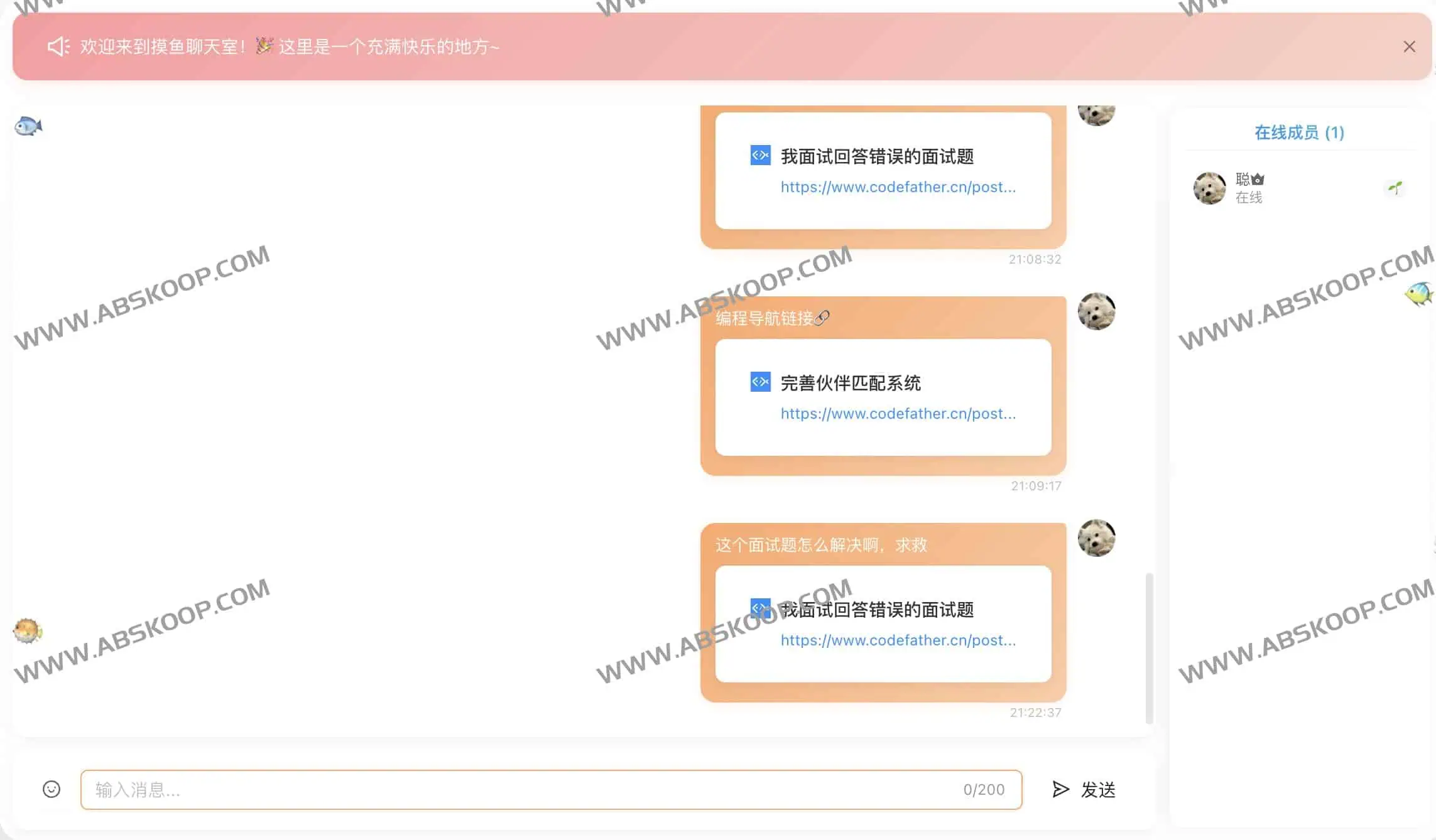 这个功能也是编程导航的🐟友提的意见,一开始是不打算走的,后面看见许多人都想要这个功能就加上了,编程导航 ➕ 摸鱼聊天,美滋滋,不会的技术直接提问、推荐的 B 站视频直接分享,大家一起学习摸鱼,共同进步。
