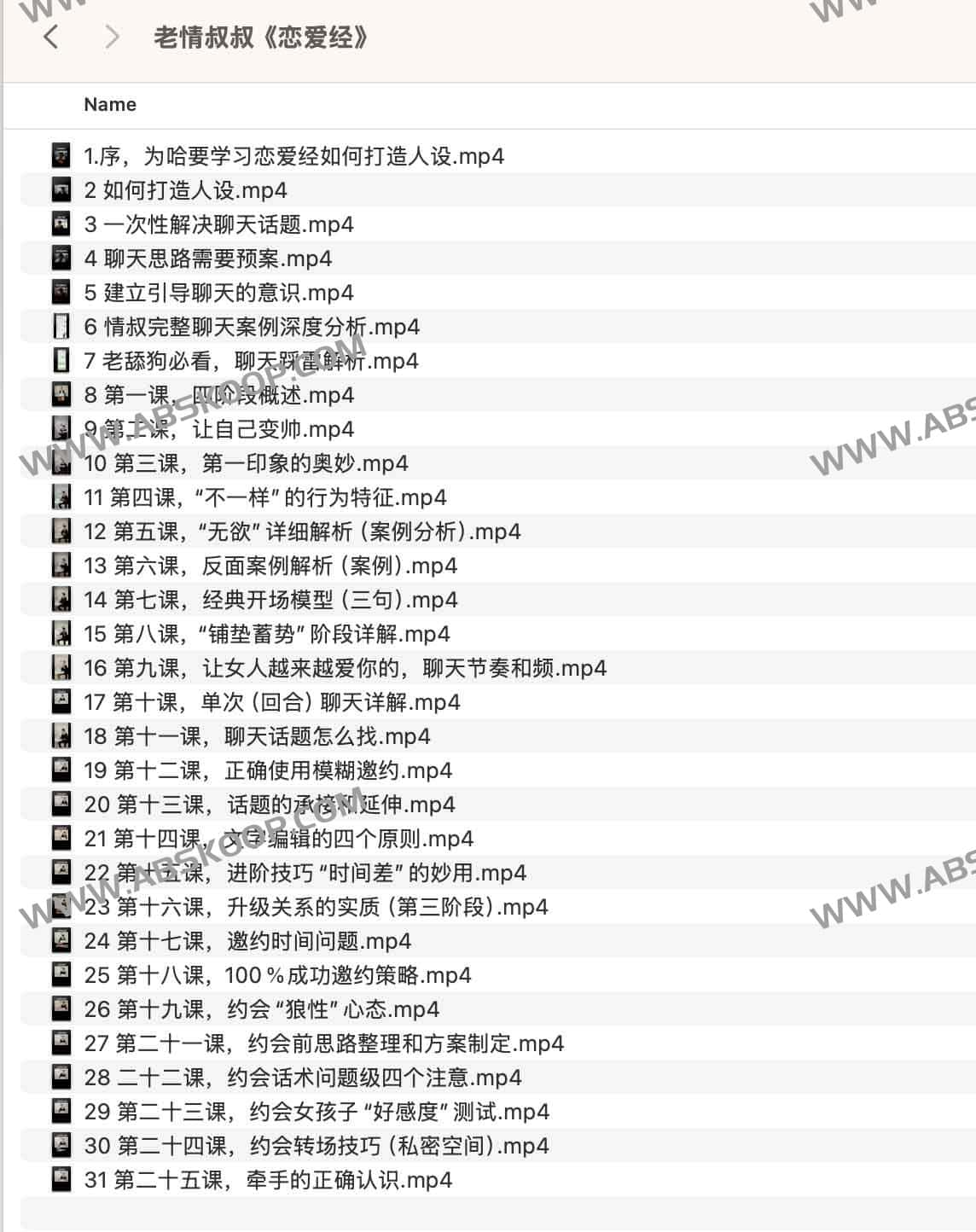 老情叔叔《恋爱经》,夸克网盘课程。这套情感成长课程系统解析现代恋爱全流程,从个人形象管理到深度关系建立层层递进。课程以人设塑造为起点,详解发型穿搭、行为特征设计等外在形象优化方案,结合心理学原理剖析第一印象塑造的视觉与语言表达要点。核心模块聚焦高效沟通技巧,提供聊天话题库构建、文字编辑四原则、模糊邀约话术等实用工具包,通过真实案例拆解常见尬聊雷区与破冰策略。
