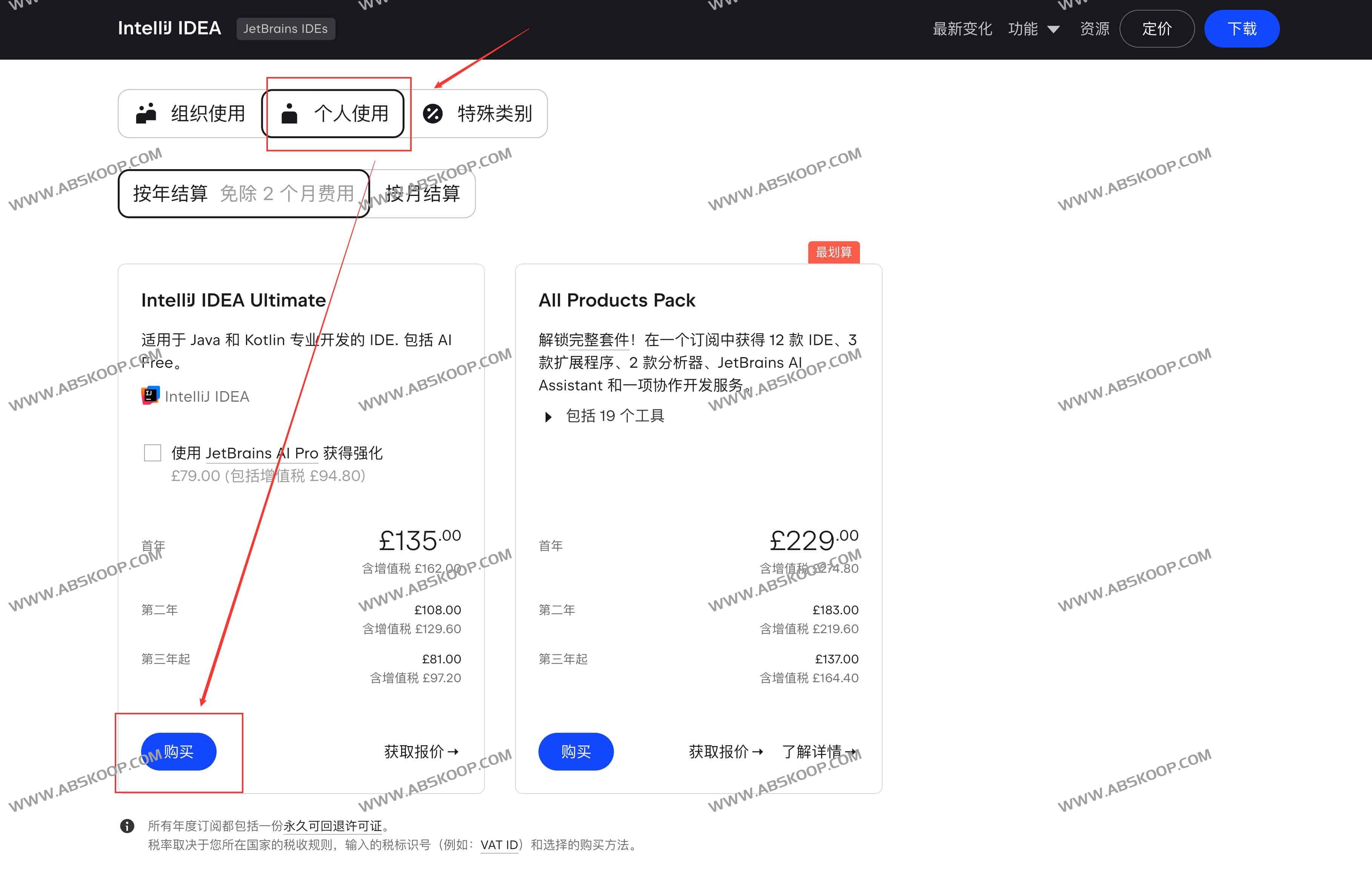打开上面下单地址,选择个人使用-按年结算,点击购买